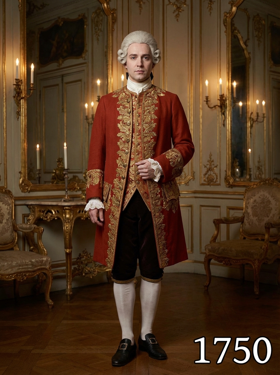 model in 1750s Georgian era portrait, wearing an ornate coat with gold brocade, knee breeches, silk stockings, and powdered wig, standing in an elegant 18th century salon with gilded mirrors and baroque furniture, painted in the style of classical portraiture with soft candlelight, text overlay in bottom corner reading "1750" in white sans serif font with black outline