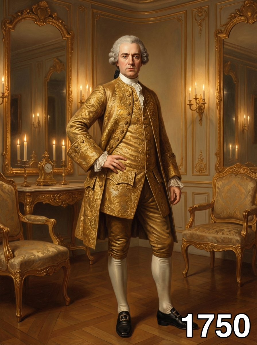 model in 1750s Georgian era portrait, wearing an ornate coat with gold brocade, knee breeches, silk stockings, and powdered wig, standing in an elegant 18th century salon with gilded mirrors and baroque furniture, painted in the style of classical portraiture with soft candlelight, text overlay in bottom corner reading "1750" in white sans serif font with black outline