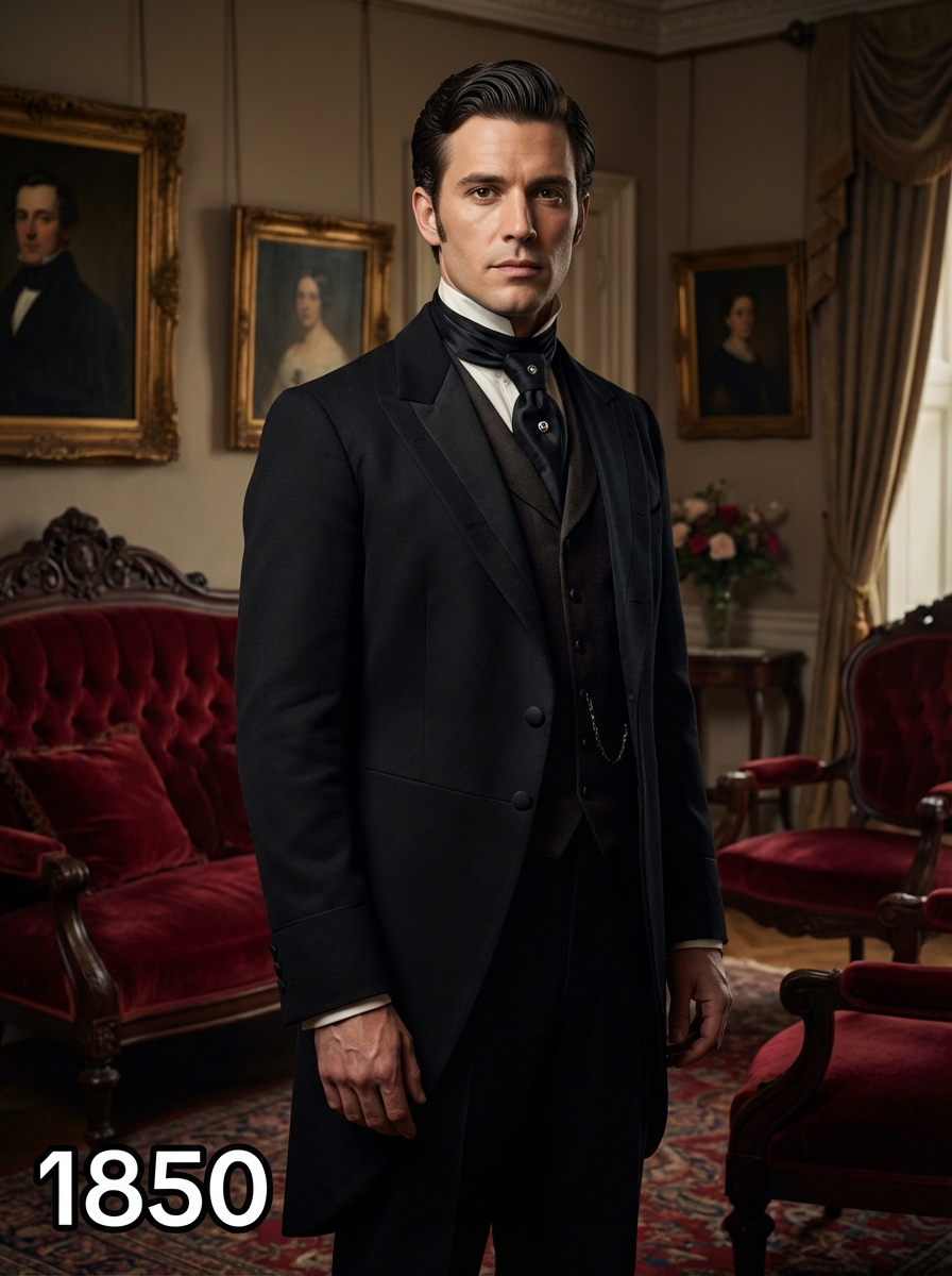 model in 1850s Victorian portrait, wearing a formal tailcoat with high collar, waistcoat, and cravat, hair parted and styled with pomade, posed in an ornate Victorian parlor with rich velvet furniture and oil paintings, dramatic chiaroscuro lighting, text overlay in bottom corner reading "1850" in white sans serif font with black outline