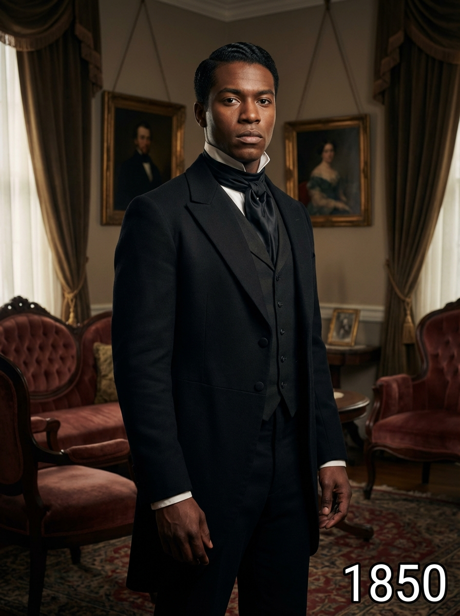 model in 1850s Victorian portrait, wearing a formal tailcoat with high collar, waistcoat, and cravat, hair parted and styled with pomade, posed in an ornate Victorian parlor with rich velvet furniture and oil paintings, dramatic chiaroscuro lighting, text overlay in bottom corner reading "1850" in white sans serif font with black outline