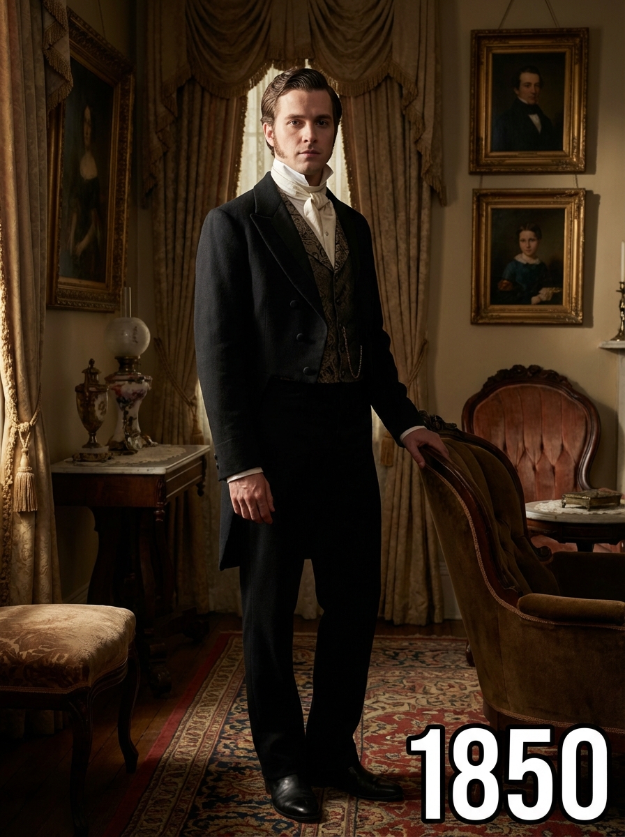 model in 1850s Victorian portrait, wearing a formal tailcoat with high collar, waistcoat, and cravat, hair parted and styled with pomade, posed in an ornate Victorian parlor with rich velvet furniture and oil paintings, dramatic chiaroscuro lighting, text overlay in bottom corner reading "1850" in white sans serif font with black outline