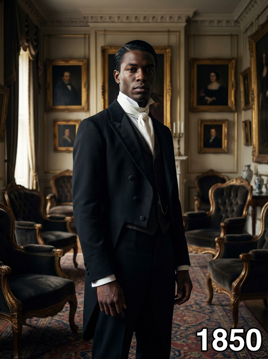 model in 1850s Victorian portrait, wearing a formal tailcoat with high collar, waistcoat, and cravat, hair parted and styled with pomade, posed in an ornate Victorian parlor with rich velvet furniture and oil paintings, dramatic chiaroscuro lighting, text overlay in bottom corner reading "1850" in white sans serif font with black outline