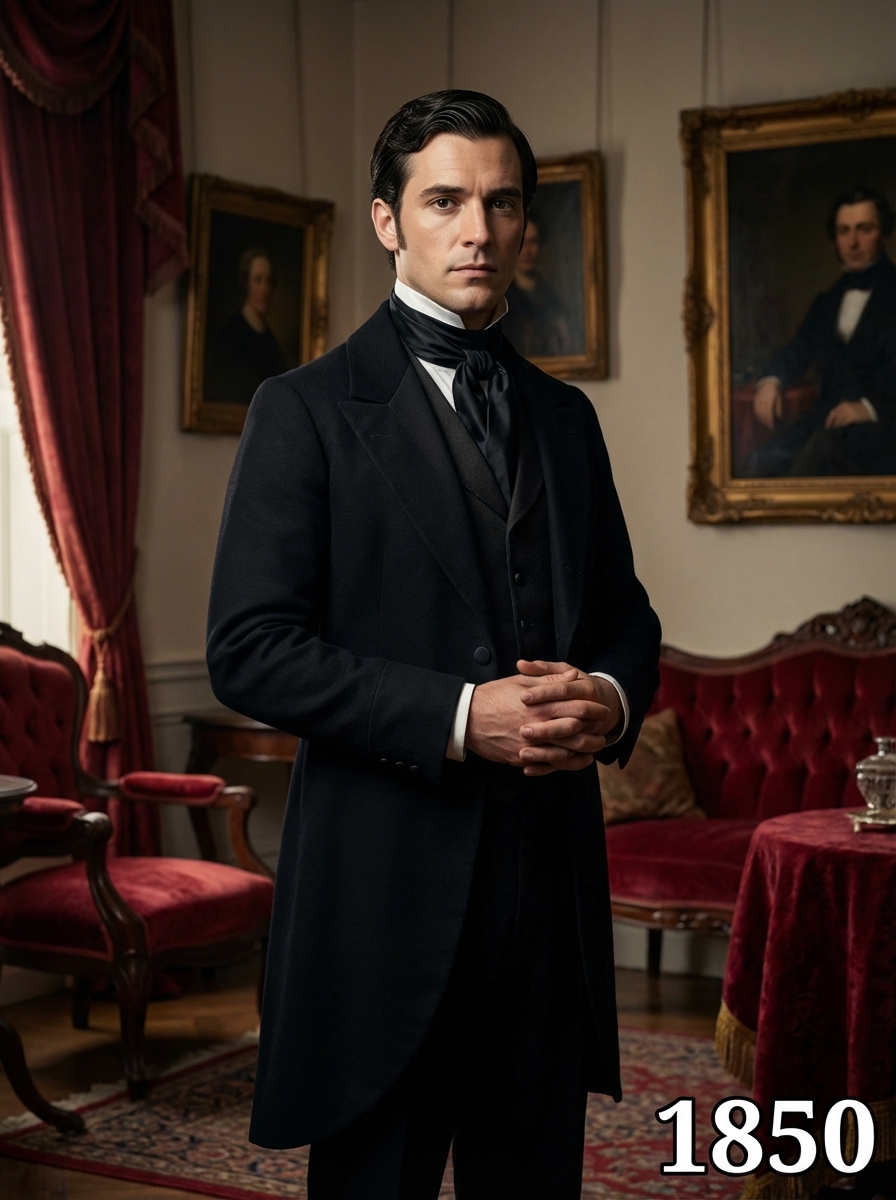 model in 1850s Victorian portrait, wearing a formal tailcoat with high collar, waistcoat, and cravat, hair parted and styled with pomade, posed in an ornate Victorian parlor with rich velvet furniture and oil paintings, dramatic chiaroscuro lighting, text overlay in bottom corner reading "1850" in white sans serif font with black outline