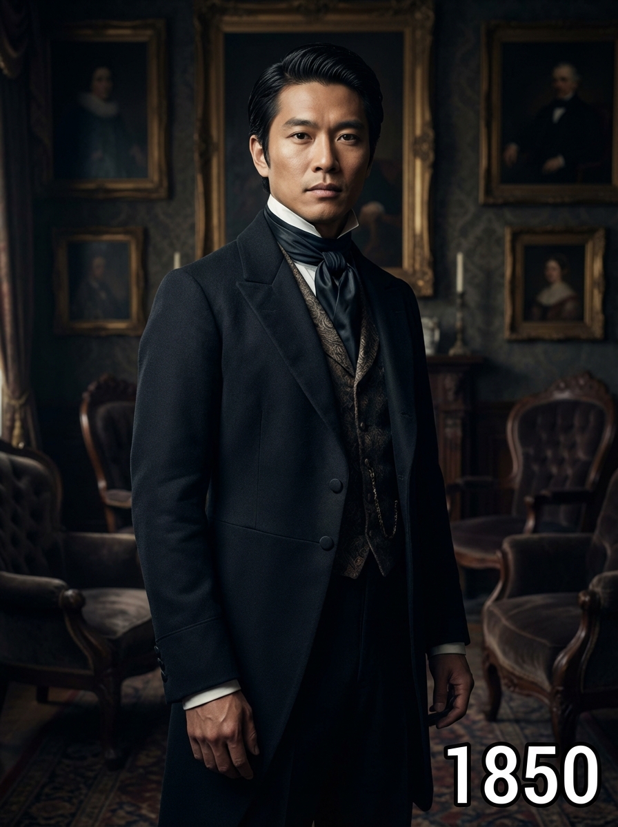 model in 1850s Victorian portrait, wearing a formal tailcoat with high collar, waistcoat, and cravat, hair parted and styled with pomade, posed in an ornate Victorian parlor with rich velvet furniture and oil paintings, dramatic chiaroscuro lighting, text overlay in bottom corner reading "1850" in white sans serif font with black outline