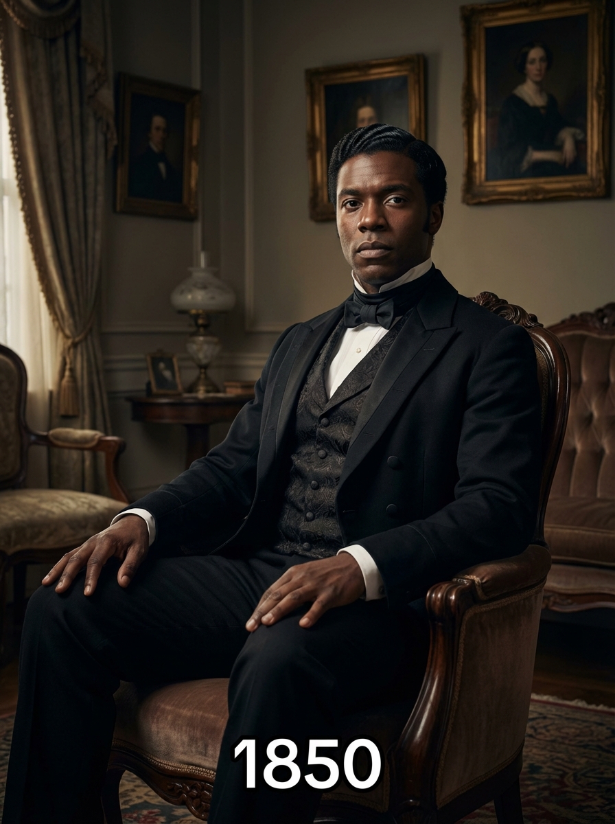 model in 1850s Victorian portrait, wearing a formal tailcoat with high collar, waistcoat, and cravat, hair parted and styled with pomade, posed in an ornate Victorian parlor with rich velvet furniture and oil paintings, dramatic chiaroscuro lighting, text overlay in bottom corner reading "1850" in white sans serif font with black outline