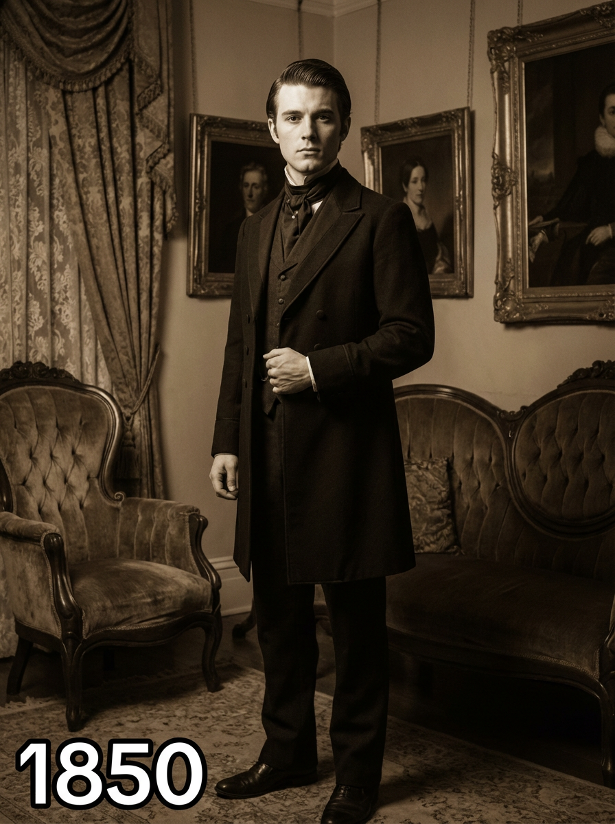 model in 1850s Victorian portrait, wearing a formal tailcoat with high collar, waistcoat, and cravat, hair parted and styled with pomade, posed in an ornate Victorian parlor with rich velvet furniture and oil paintings, dramatic chiaroscuro lighting, text overlay in bottom corner reading "1850" in white sans serif font with black outline