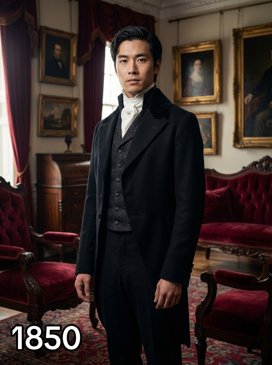 model in 1850s Victorian portrait, wearing a formal tailcoat with high collar, waistcoat, and cravat, hair parted and styled with pomade, posed in an ornate Victorian parlor with rich velvet furniture and oil paintings, dramatic chiaroscuro lighting, text overlay in bottom corner reading "1850" in white sans serif font with black outline