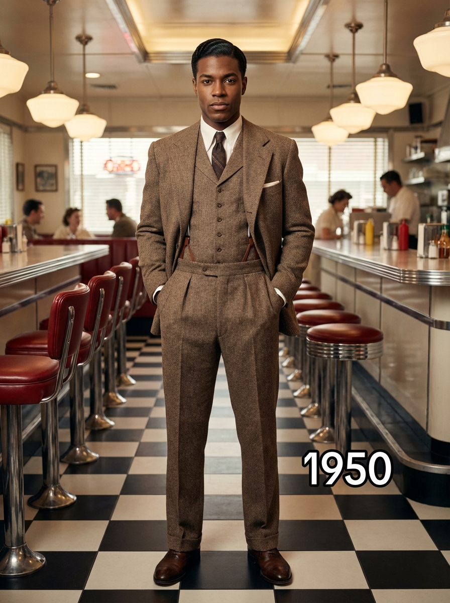 model in 1950s style portrait, wearing a sharp three-piece suit with suspenders and slicked-back hair, standing in a vintage diner with checkered floors and chrome details, soft studio lighting reminiscent of golden age Hollywood glamour photography, text overlay in bottom corner reading "1950" in white sans serif font with black outline