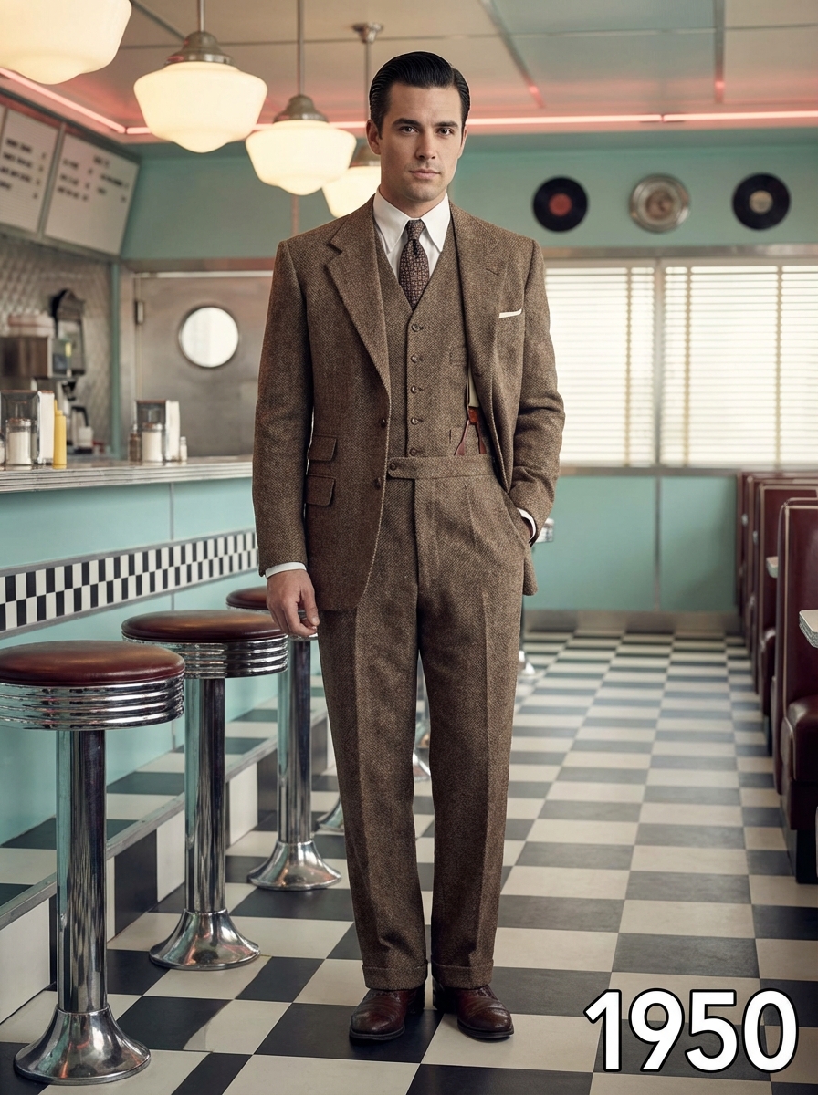 model in 1950s style portrait, wearing a sharp three-piece suit with suspenders and slicked-back hair, standing in a vintage diner with checkered floors and chrome details, soft studio lighting reminiscent of golden age Hollywood glamour photography, text overlay in bottom corner reading "1950" in white sans serif font with black outline