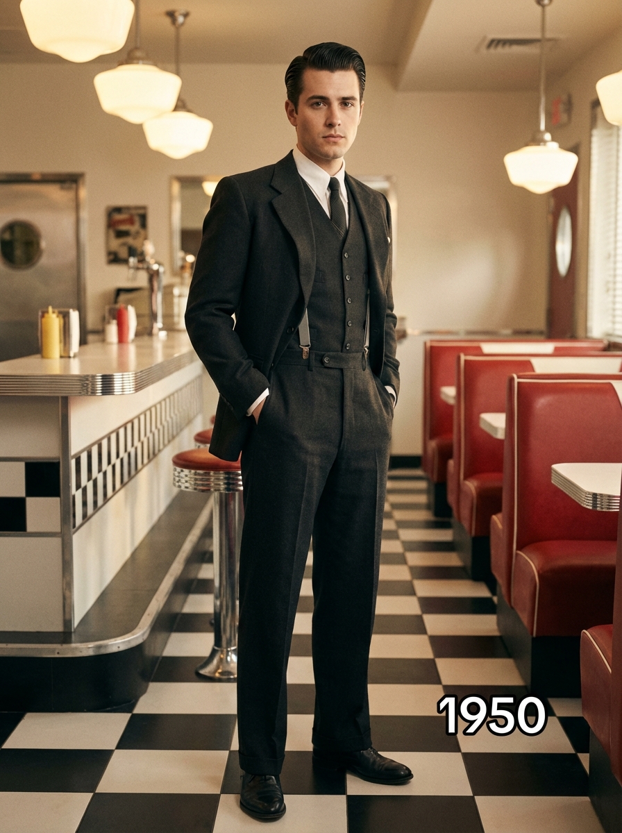 model in 1950s style portrait, wearing a sharp three-piece suit with suspenders and slicked-back hair, standing in a vintage diner with checkered floors and chrome details, soft studio lighting reminiscent of golden age Hollywood glamour photography, text overlay in bottom corner reading "1950" in white sans serif font with black outline