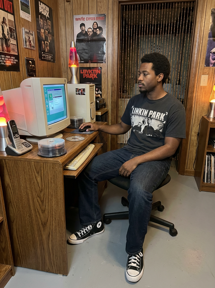 model in a 2000s basement with wood paneling, wearing a band t-shirt with jeans and Converse sneakers, sitting at a computer desk with a collection of burned CDs in spindle cases, cordless phone on the counter, beaded curtains and lava lamps decorating the space