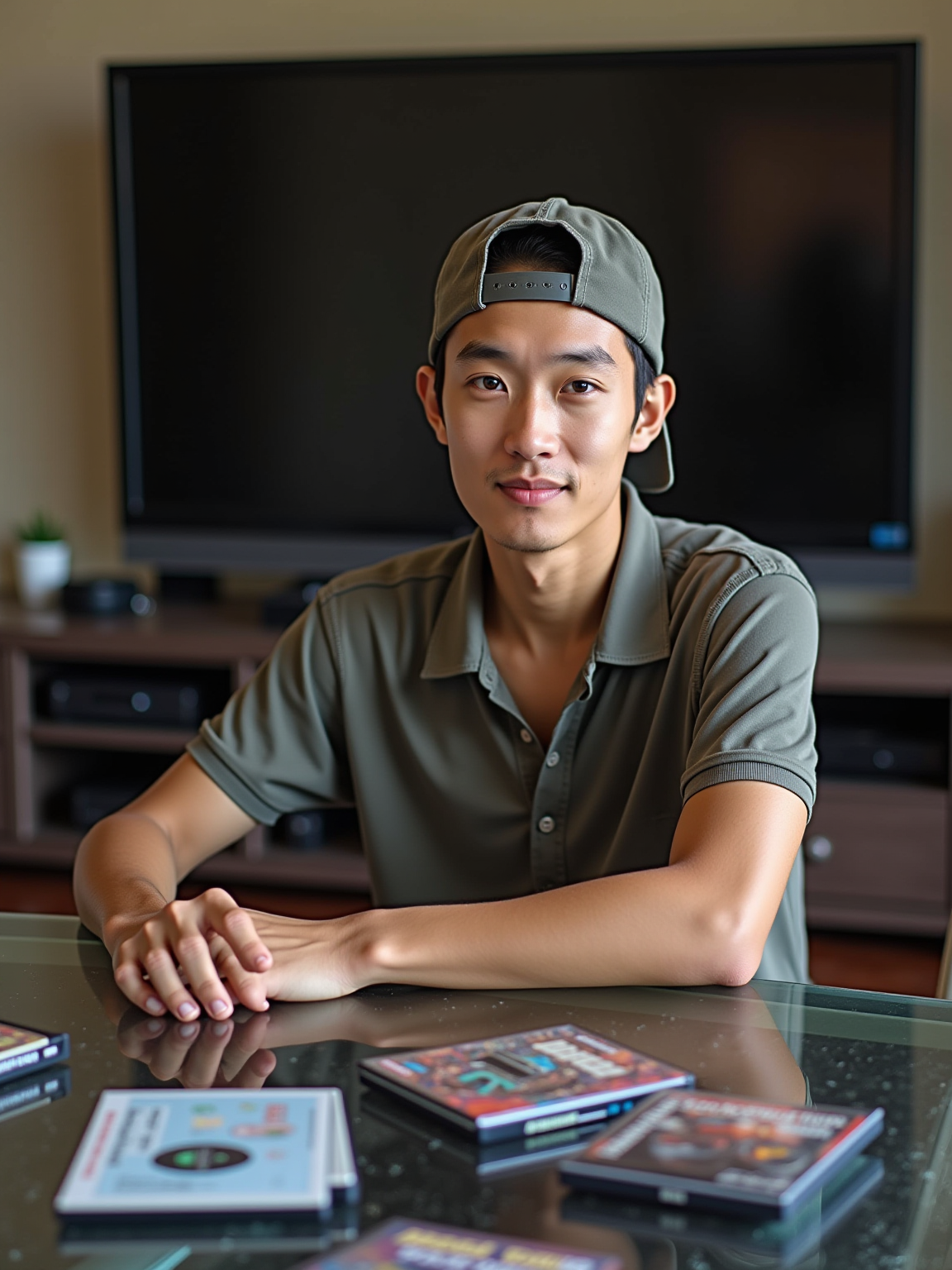 model in a 2000s living room with glass coffee table, wearing a polo shirt with backwards baseball cap, sitting next to a entertainment center with DVD player, collection of DVDs spread on the table, big-screen TV with VHS player underneath