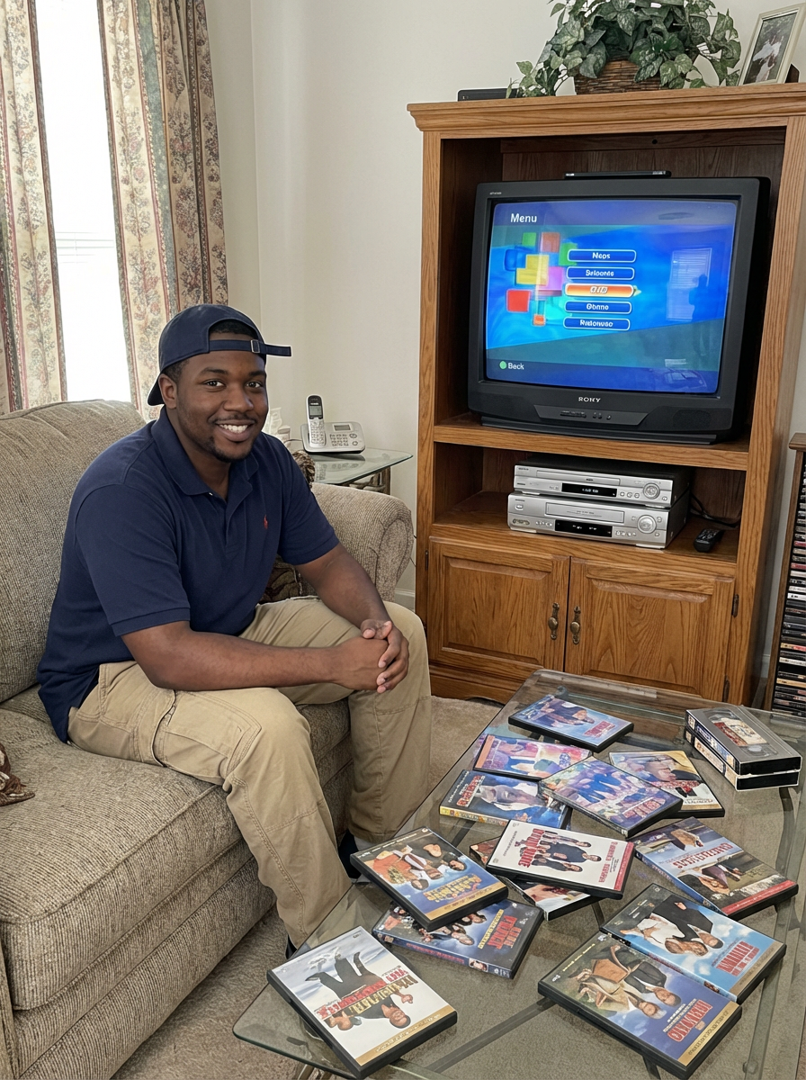 model in a 2000s living room with glass coffee table, wearing a polo shirt with backwards baseball cap, sitting next to a entertainment center with DVD player, collection of DVDs spread on the table, big-screen TV with VHS player underneath