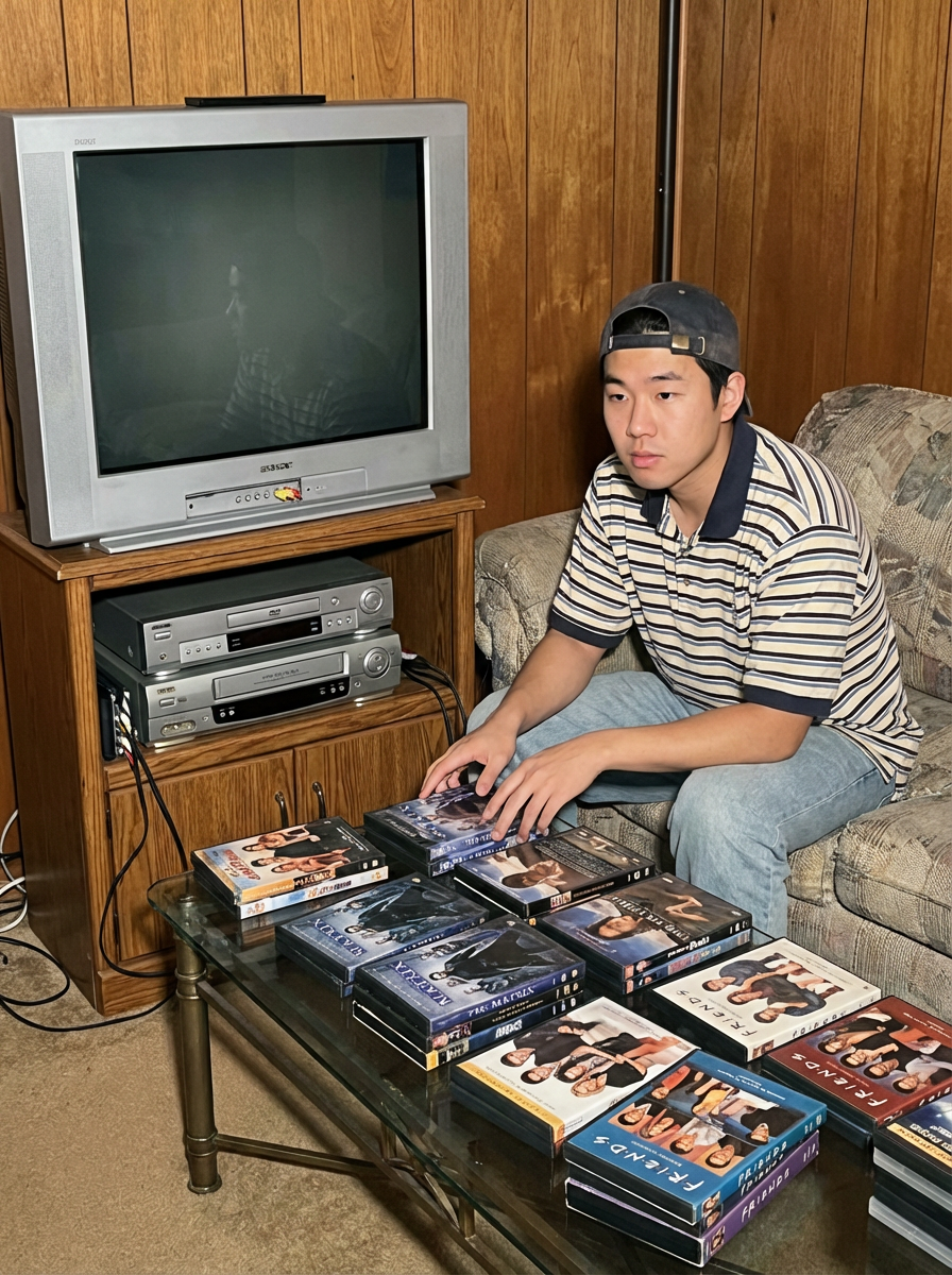 model in a 2000s living room with glass coffee table, wearing a polo shirt with backwards baseball cap, sitting next to a entertainment center with DVD player, collection of DVDs spread on the table, big-screen TV with VHS player underneath