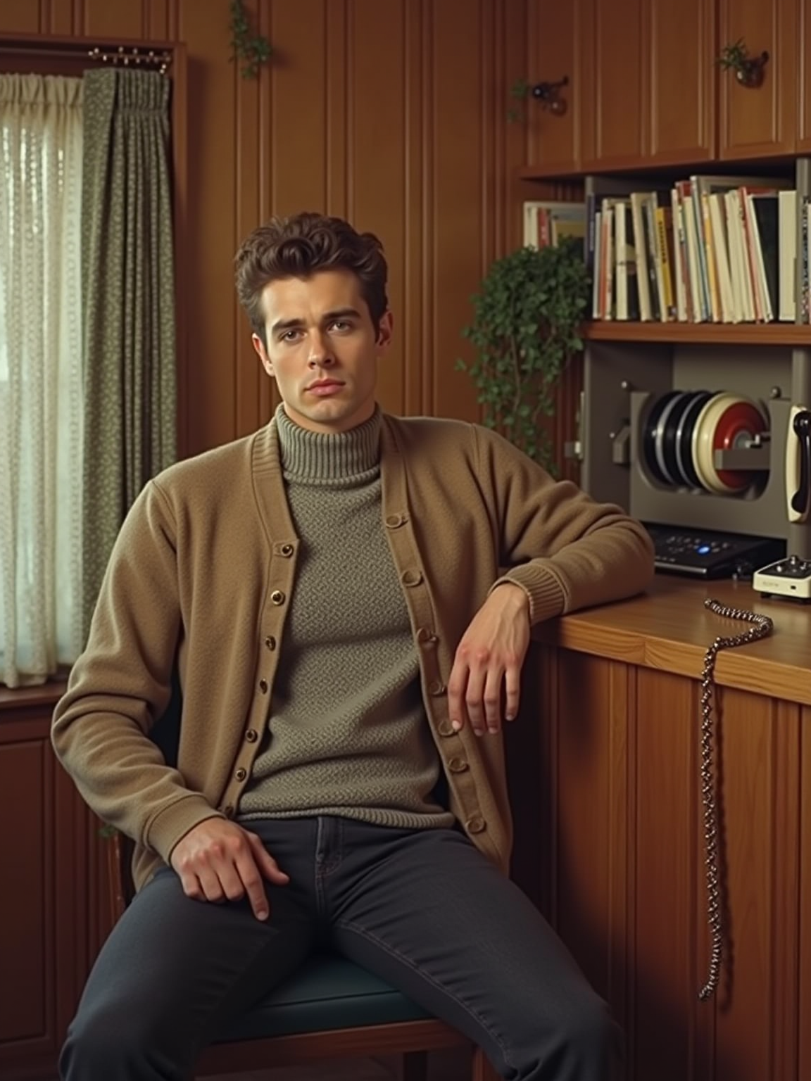 model in a 60s basement rec room with wood paneling, wearing a mock turtleneck with cardigan sweater, sitting at a built-in bar with a collection of 45s in a carousel rack, wall-mounted phone with long coiled cord, beaded curtains and hanging plants decorating the space