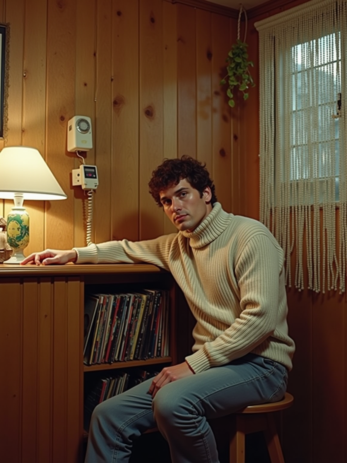 model in a 60s basement rec room with wood paneling, wearing a mock turtleneck with cardigan sweater, sitting at a built-in bar with a collection of 45s in a carousel rack, wall-mounted phone with long coiled cord, beaded curtains and hanging plants decorating the space