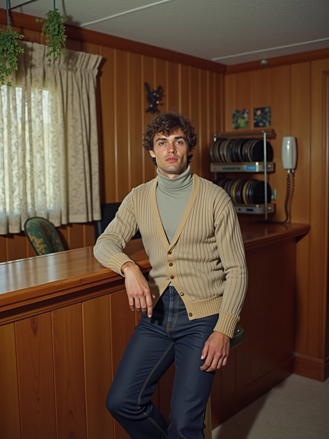 model in a 60s basement rec room with wood paneling, wearing a mock turtleneck with cardigan sweater, sitting at a built-in bar with a collection of 45s in a carousel rack, wall-mounted phone with long coiled cord, beaded curtains and hanging plants decorating the space