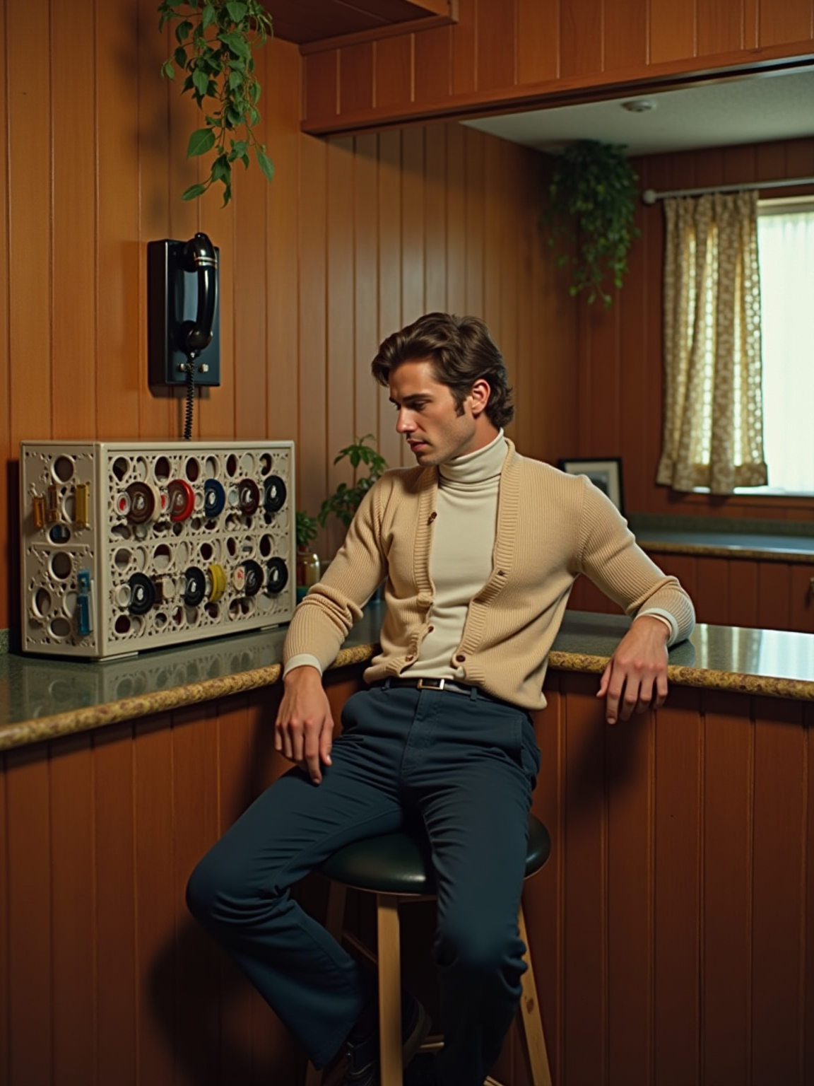 model in a 60s basement rec room with wood paneling, wearing a mock turtleneck with cardigan sweater, sitting at a built-in bar with a collection of 45s in a carousel rack, wall-mounted phone with long coiled cord, beaded curtains and hanging plants decorating the space