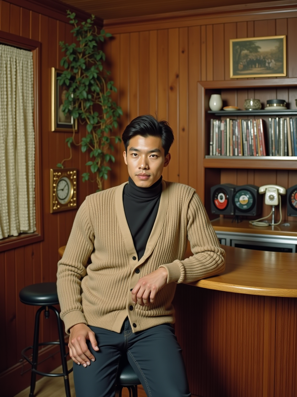 model in a 60s basement rec room with wood paneling, wearing a mock turtleneck with cardigan sweater, sitting at a built-in bar with a collection of 45s in a carousel rack, wall-mounted phone with long coiled cord, beaded curtains and hanging plants decorating the space
