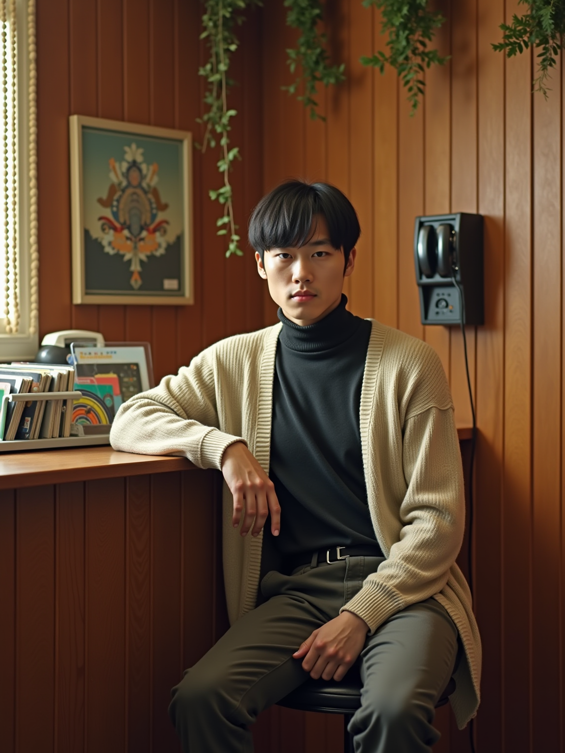 model in a 60s basement rec room with wood paneling, wearing a mock turtleneck with cardigan sweater, sitting at a built-in bar with a collection of 45s in a carousel rack, wall-mounted phone with long coiled cord, beaded curtains and hanging plants decorating the space