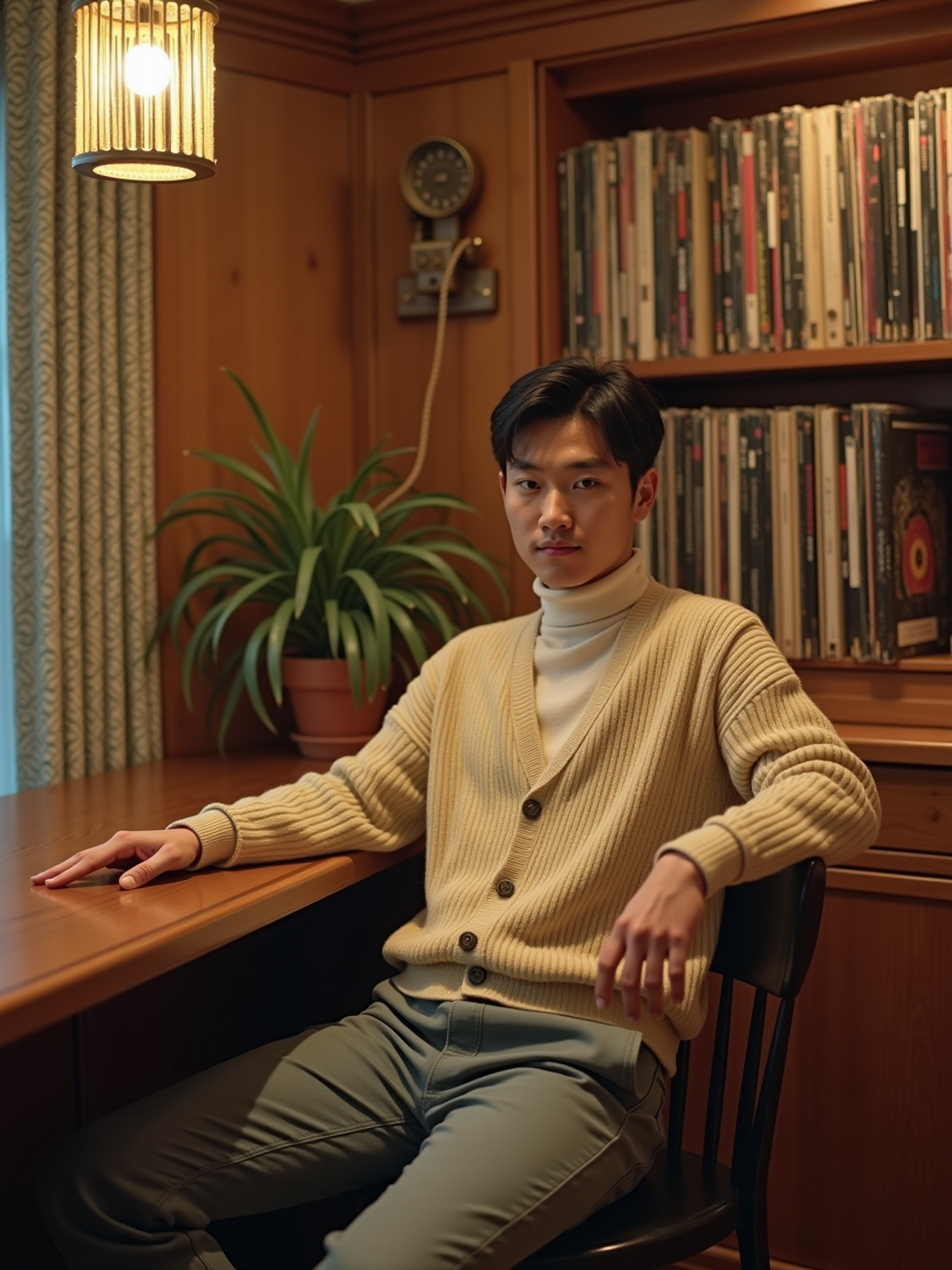 model in a 60s basement rec room with wood paneling, wearing a mock turtleneck with cardigan sweater, sitting at a built-in bar with a collection of 45s in a carousel rack, wall-mounted phone with long coiled cord, beaded curtains and hanging plants decorating the space