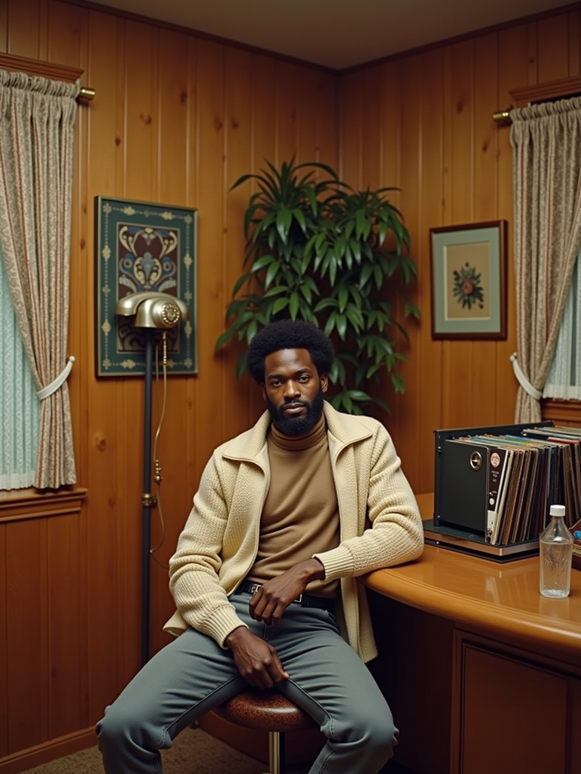 model in a 60s basement rec room with wood paneling, wearing a mock turtleneck with cardigan sweater, sitting at a built-in bar with a collection of 45s in a carousel rack, wall-mounted phone with long coiled cord, beaded curtains and hanging plants decorating the space