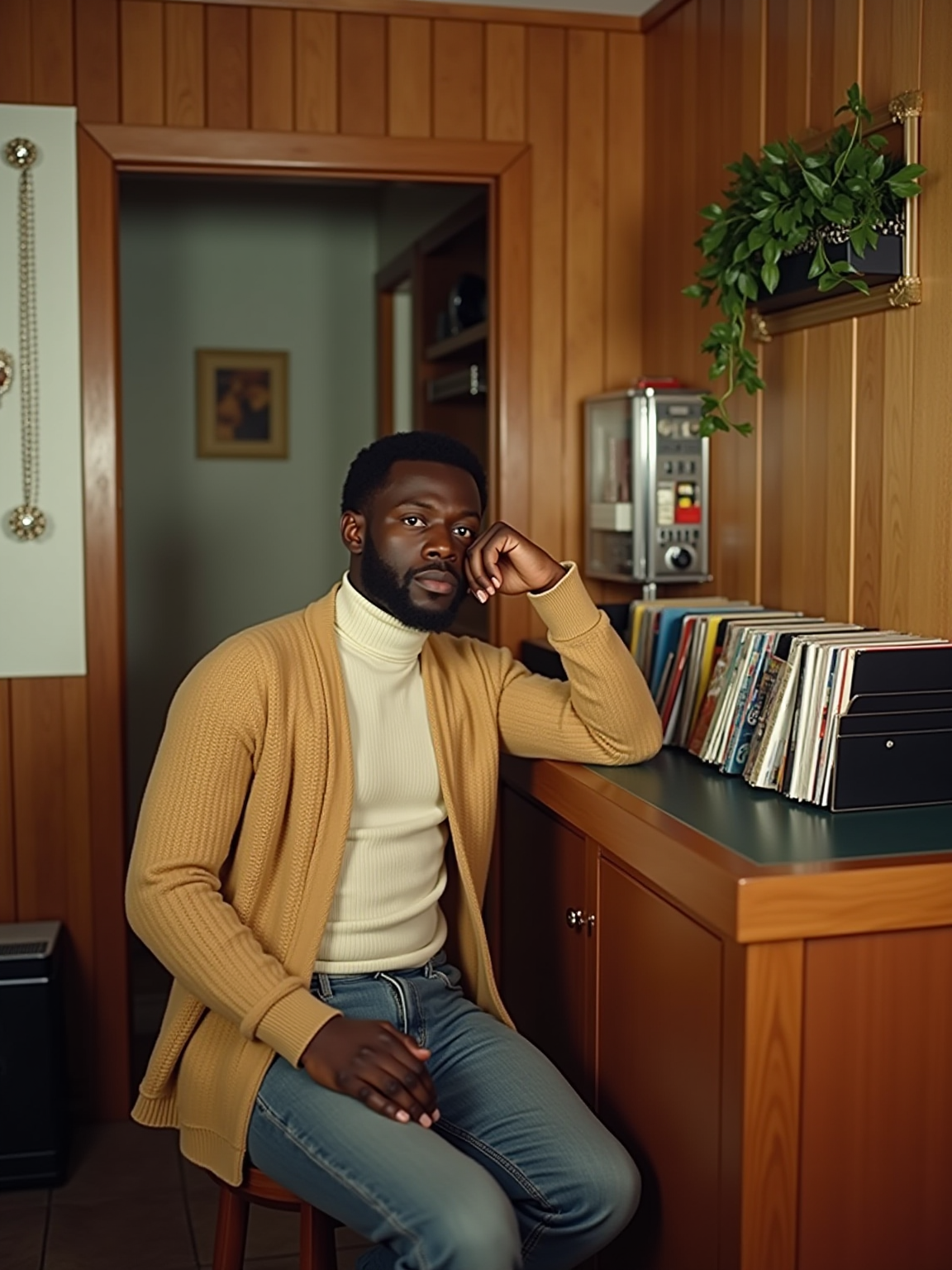 model in a 60s basement rec room with wood paneling, wearing a mock turtleneck with cardigan sweater, sitting at a built-in bar with a collection of 45s in a carousel rack, wall-mounted phone with long coiled cord, beaded curtains and hanging plants decorating the space