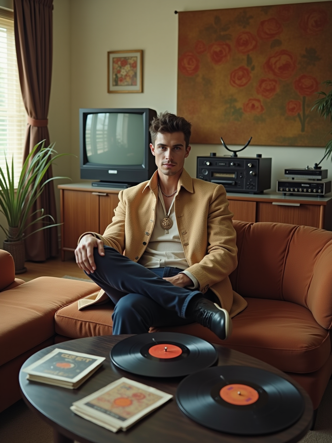 model in a 60s living room with sunken conversation pit, wearing a nehru jacket with medallion necklace, sitting next to a hi-fi stereo console, collection of vinyl LPs spread on a kidney-shaped coffee table, black and white TV with rabbit ears antenna