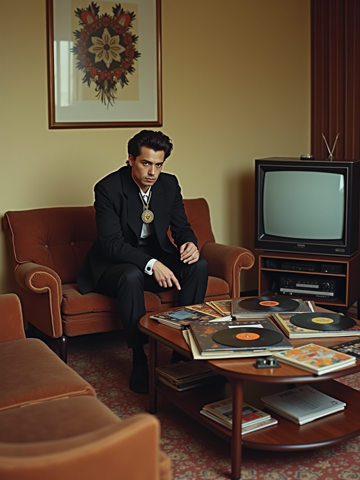 model in a 60s living room with sunken conversation pit, wearing a nehru jacket with medallion necklace, sitting next to a hi-fi stereo console, collection of vinyl LPs spread on a kidney-shaped coffee table, black and white TV with rabbit ears antenna