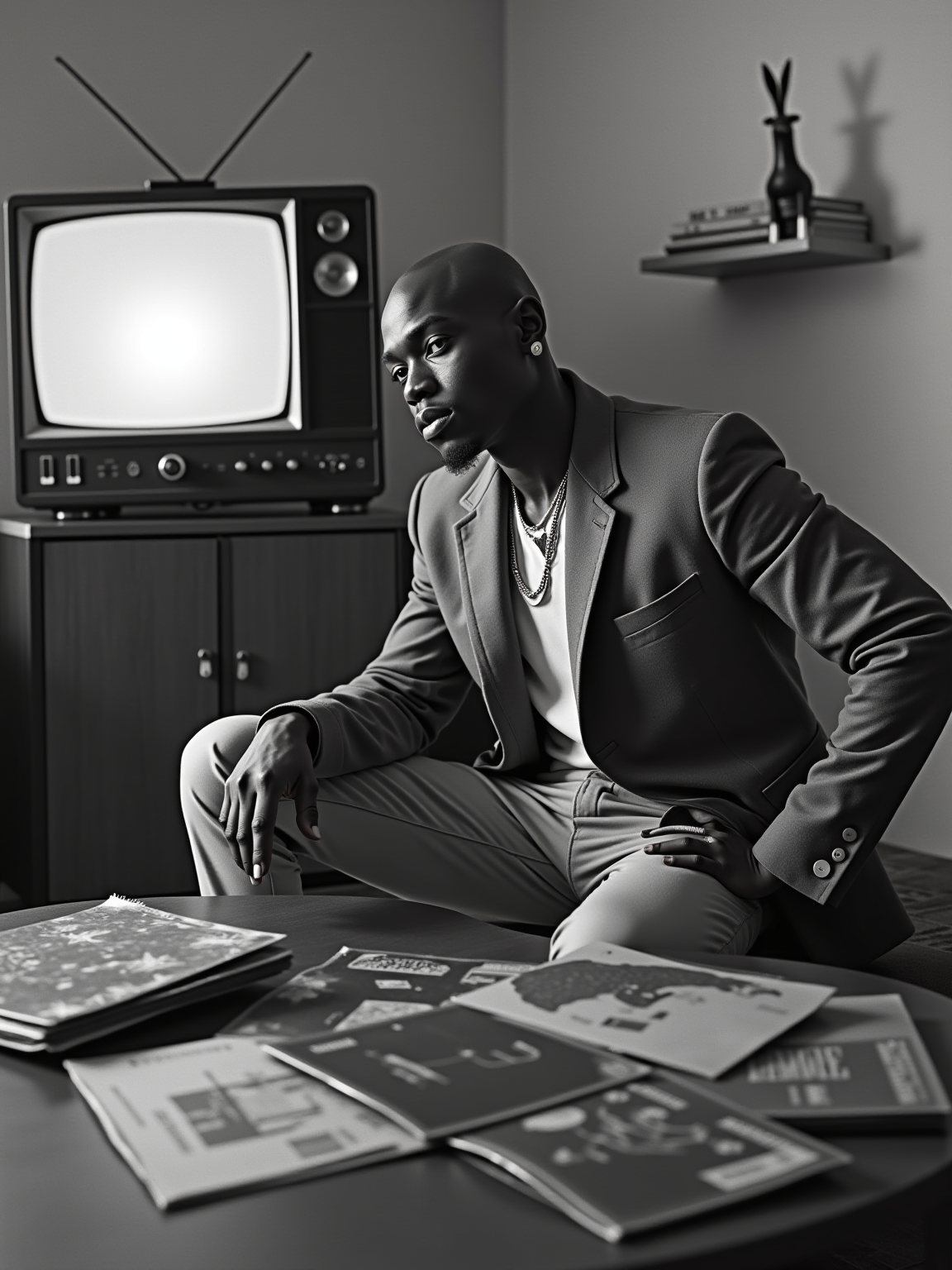 model in a 60s living room with sunken conversation pit, wearing a nehru jacket with medallion necklace, sitting next to a hi-fi stereo console, collection of vinyl LPs spread on a kidney-shaped coffee table, black and white TV with rabbit ears antenna