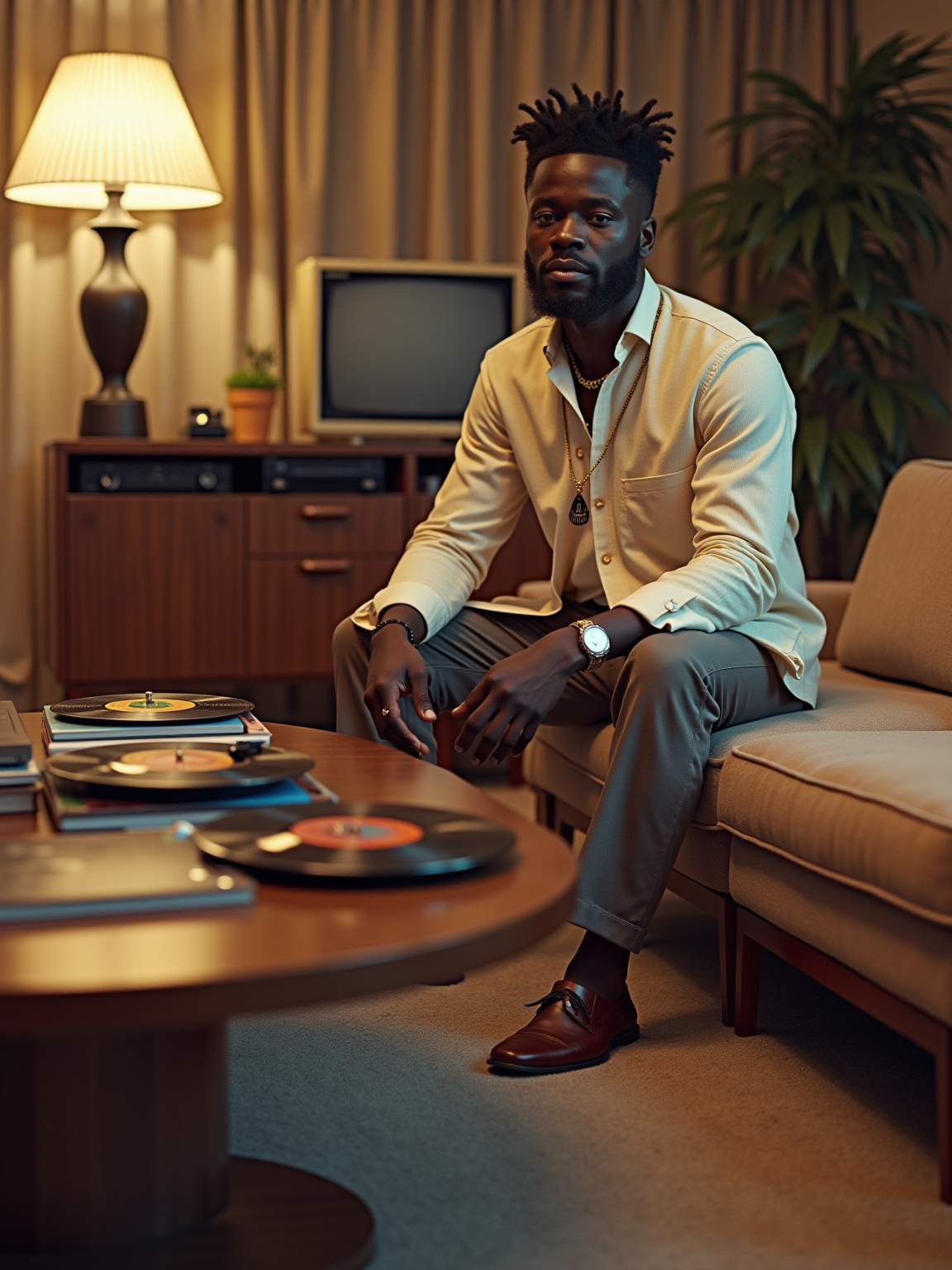 model in a 60s living room with sunken conversation pit, wearing a nehru jacket with medallion necklace, sitting next to a hi-fi stereo console, collection of vinyl LPs spread on a kidney-shaped coffee table, black and white TV with rabbit ears antenna