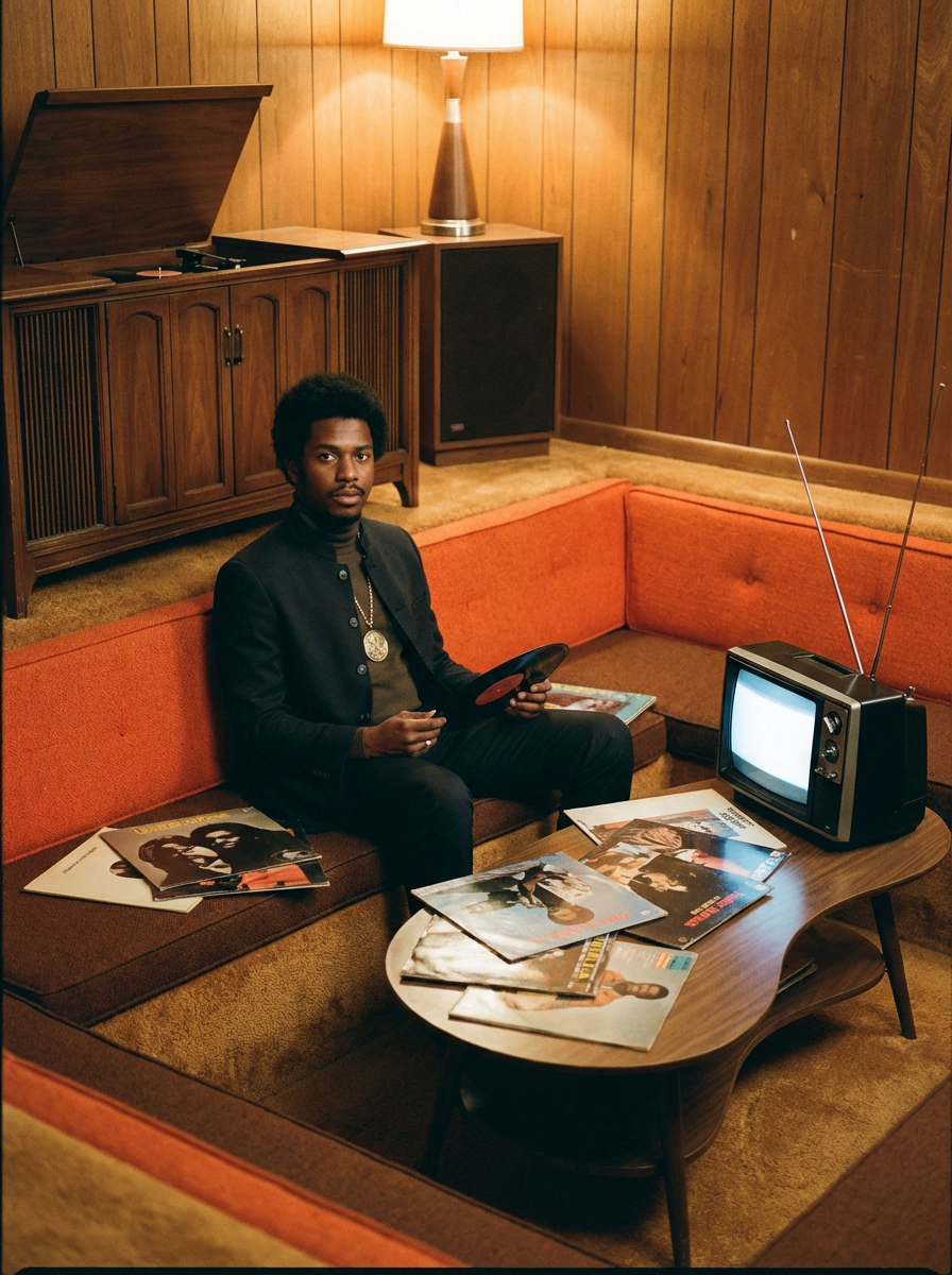 model in a 60s living room with sunken conversation pit, wearing a nehru jacket with medallion necklace, sitting next to a hi-fi stereo console, collection of vinyl LPs spread on a kidney-shaped coffee table, black and white TV with rabbit ears antenna