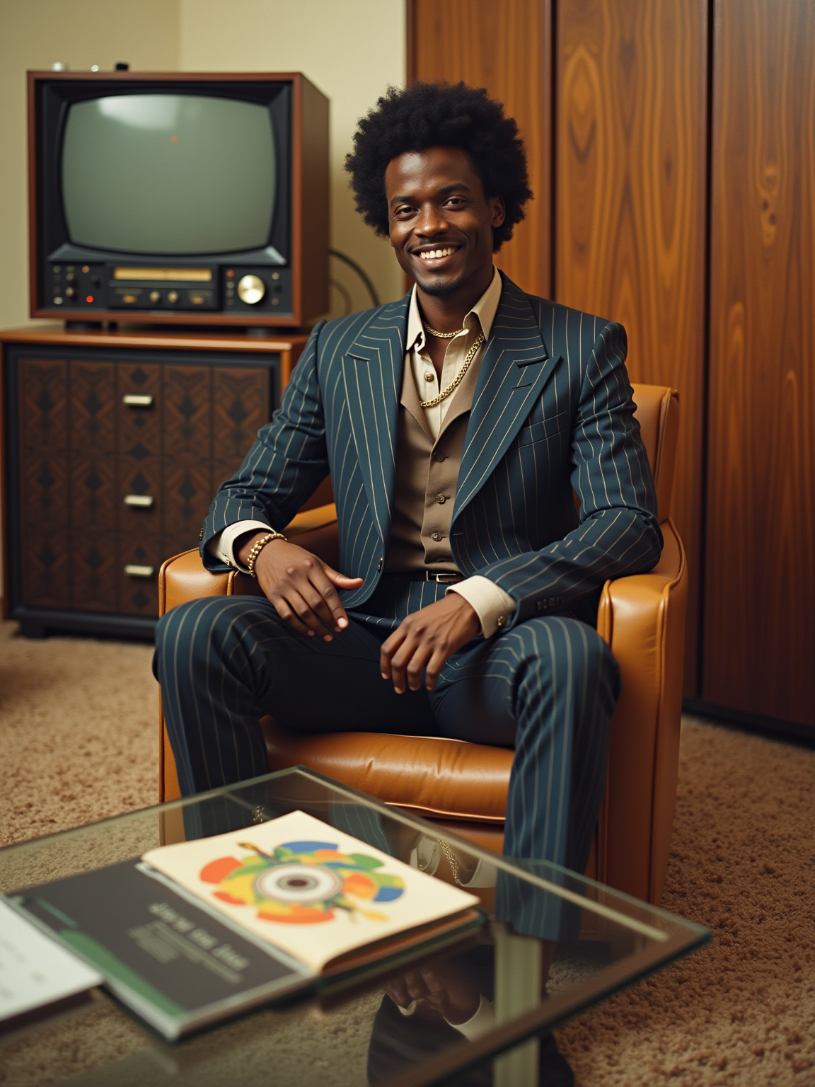 model in a 70s living room with shag carpet, wearing a leisure suit with wide lapels and chain necklace, sitting next to a console stereo with built-in turntable, collection of vinyl records spread on a glass coffee table with geometric base, wood-paneled TV with dial tuner