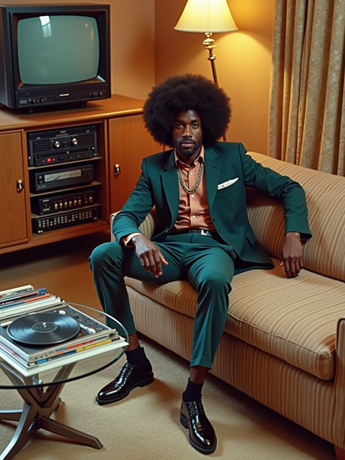 model in a 70s living room with shag carpet, wearing a leisure suit with wide lapels and chain necklace, sitting next to a console stereo with built-in turntable, collection of vinyl records spread on a glass coffee table with geometric base, wood-paneled TV with dial tuner