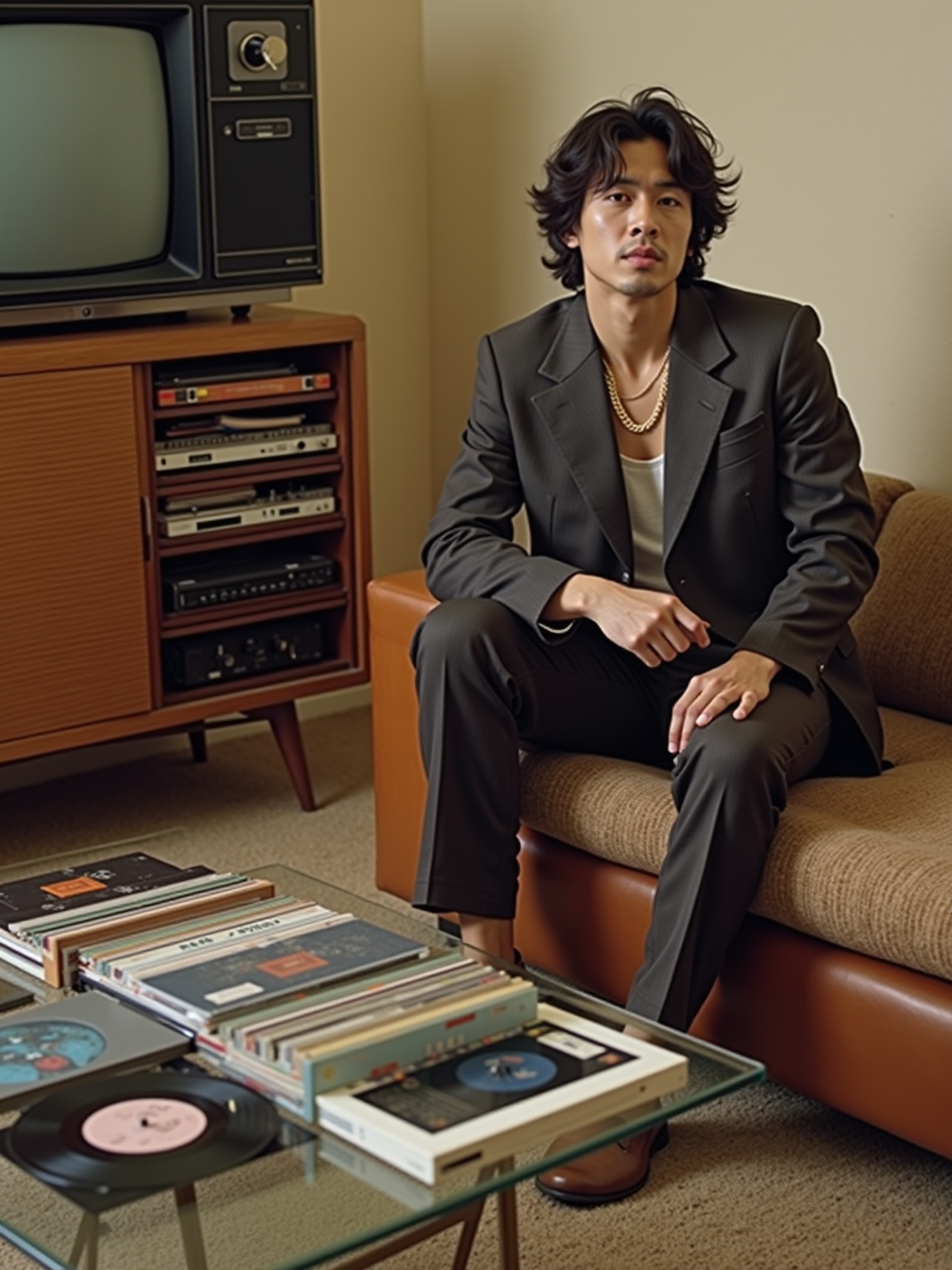 model in a 70s living room with shag carpet, wearing a leisure suit with wide lapels and chain necklace, sitting next to a console stereo with built-in turntable, collection of vinyl records spread on a glass coffee table with geometric base, wood-paneled TV with dial tuner