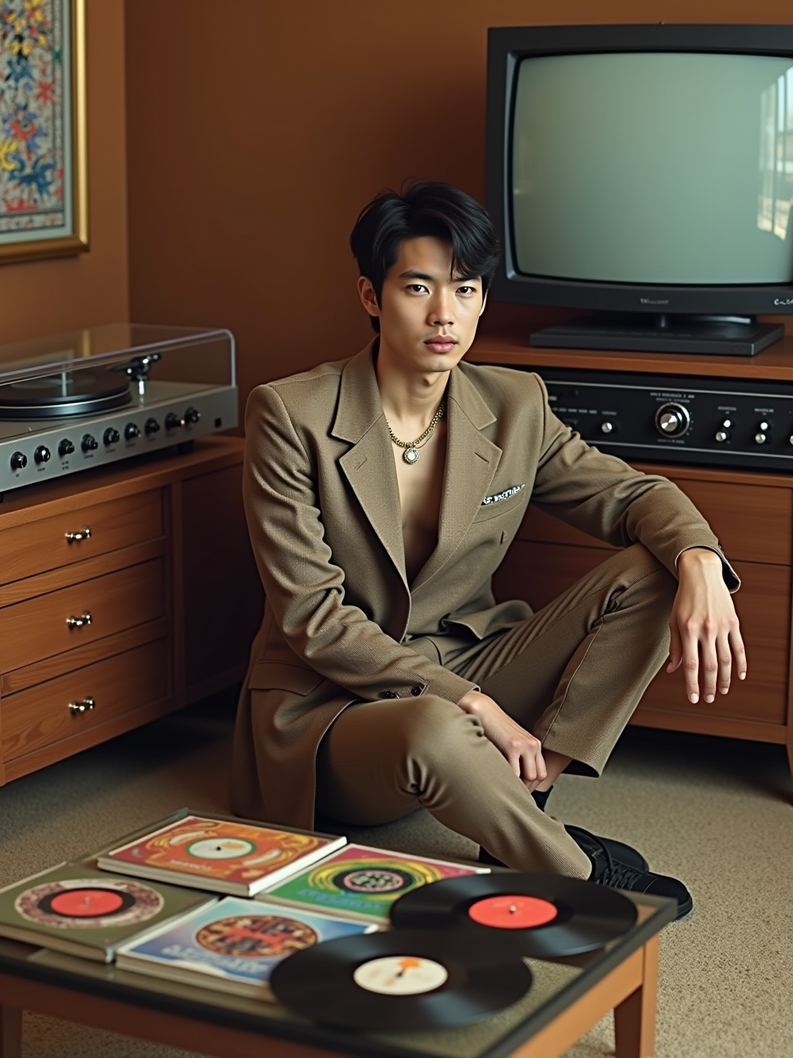 model in a 70s living room with shag carpet, wearing a leisure suit with wide lapels and chain necklace, sitting next to a console stereo with built-in turntable, collection of vinyl records spread on a glass coffee table with geometric base, wood-paneled TV with dial tuner