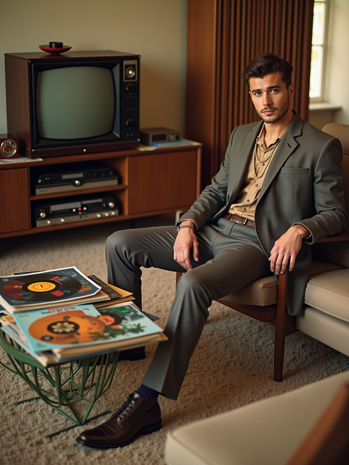 model in a 70s living room with shag carpet, wearing a leisure suit with wide lapels and chain necklace, sitting next to a console stereo with built-in turntable, collection of vinyl records spread on a glass coffee table with geometric base, wood-paneled TV with dial tuner