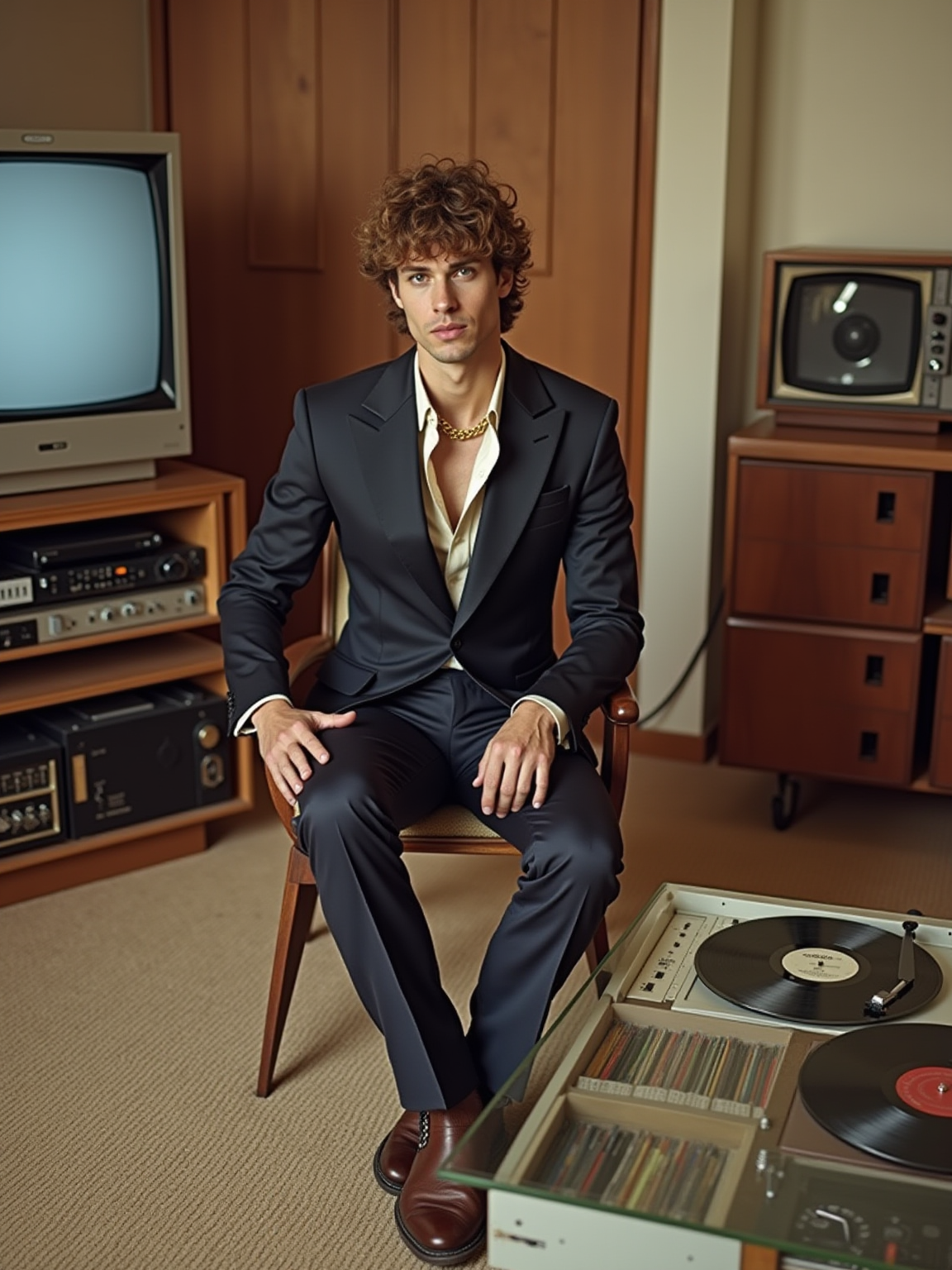 model in a 70s living room with shag carpet, wearing a leisure suit with wide lapels and chain necklace, sitting next to a console stereo with built-in turntable, collection of vinyl records spread on a glass coffee table with geometric base, wood-paneled TV with dial tuner