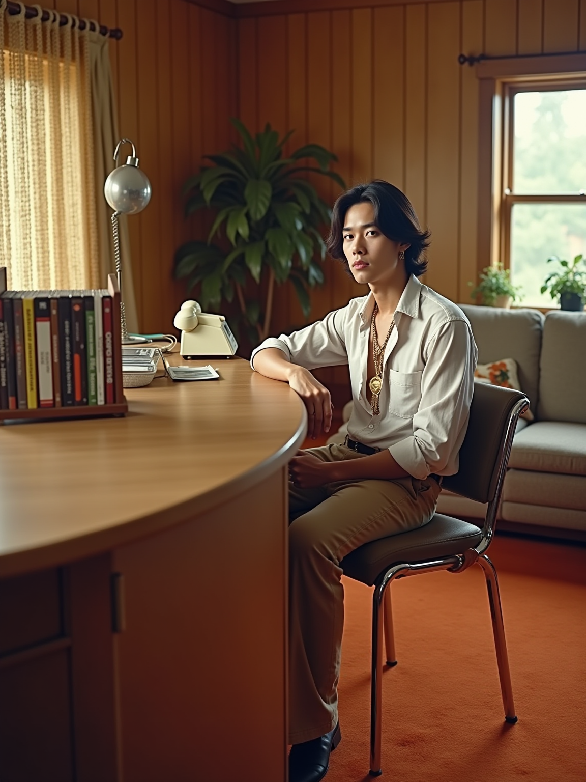 model in a 70s rec room with wood paneling and orange carpet, wearing polyester shirt unbuttoned with medallion necklace, sitting at a bar area with a collection of 8-track tapes in a wooden rack, rotary phone on the counter, beaded curtains and hanging plants decorating the space
