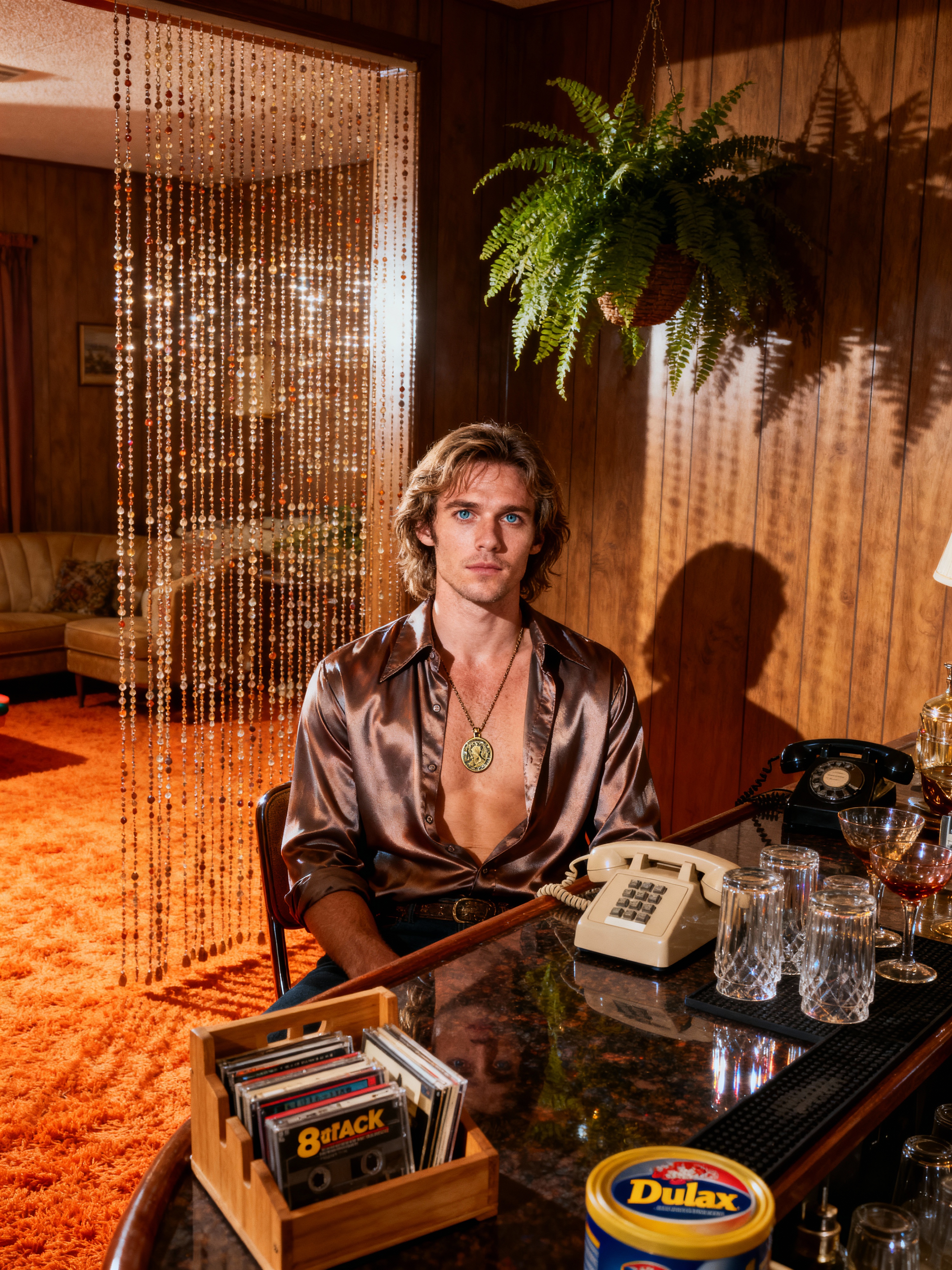 model in a 70s rec room with wood paneling and orange carpet, wearing polyester shirt unbuttoned with medallion necklace, sitting at a bar area with a collection of 8-track tapes in a wooden rack, rotary phone on the counter, beaded curtains and hanging plants decorating the space