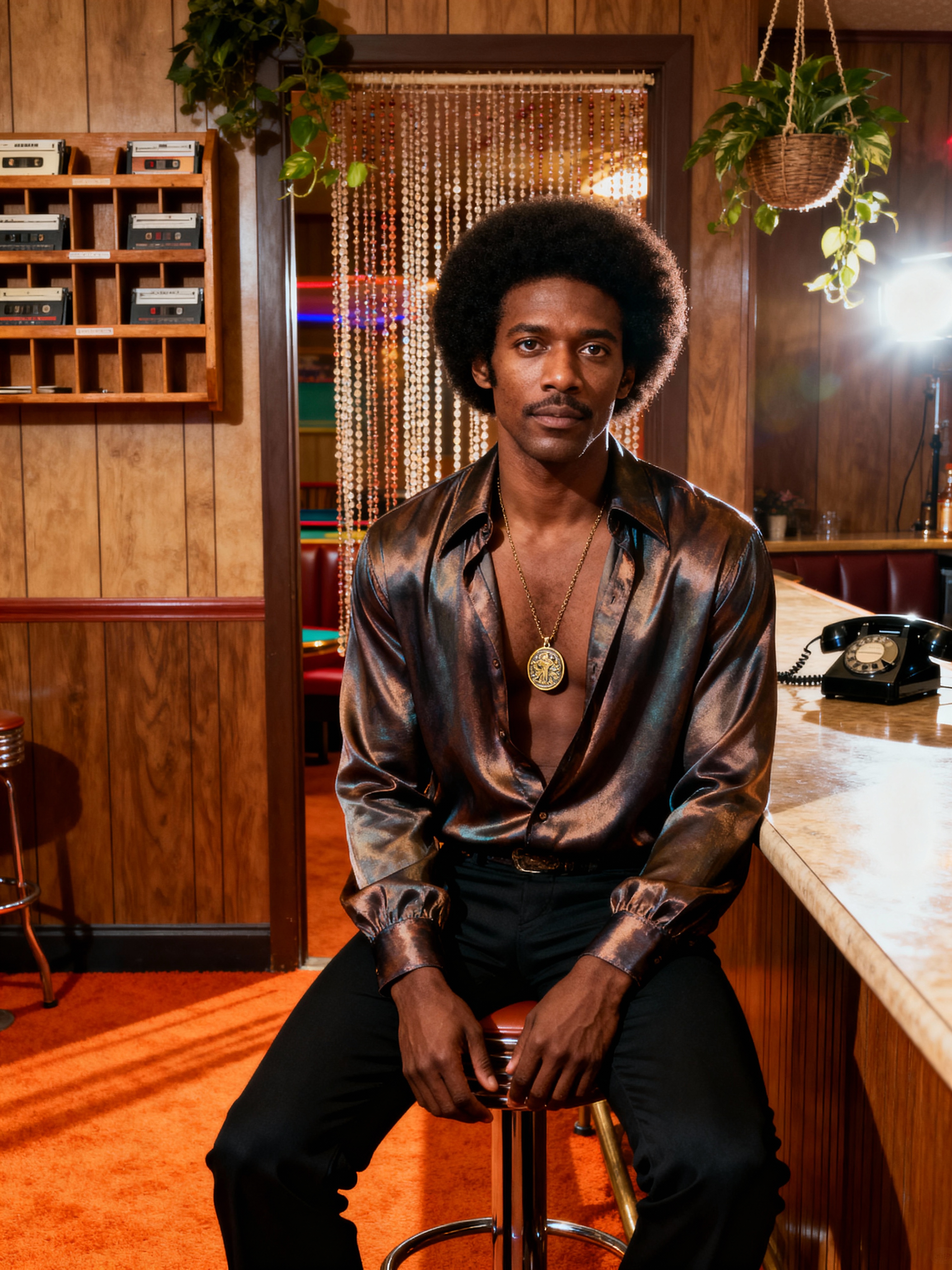 model in a 70s rec room with wood paneling and orange carpet, wearing polyester shirt unbuttoned with medallion necklace, sitting at a bar area with a collection of 8-track tapes in a wooden rack, rotary phone on the counter, beaded curtains and hanging plants decorating the space