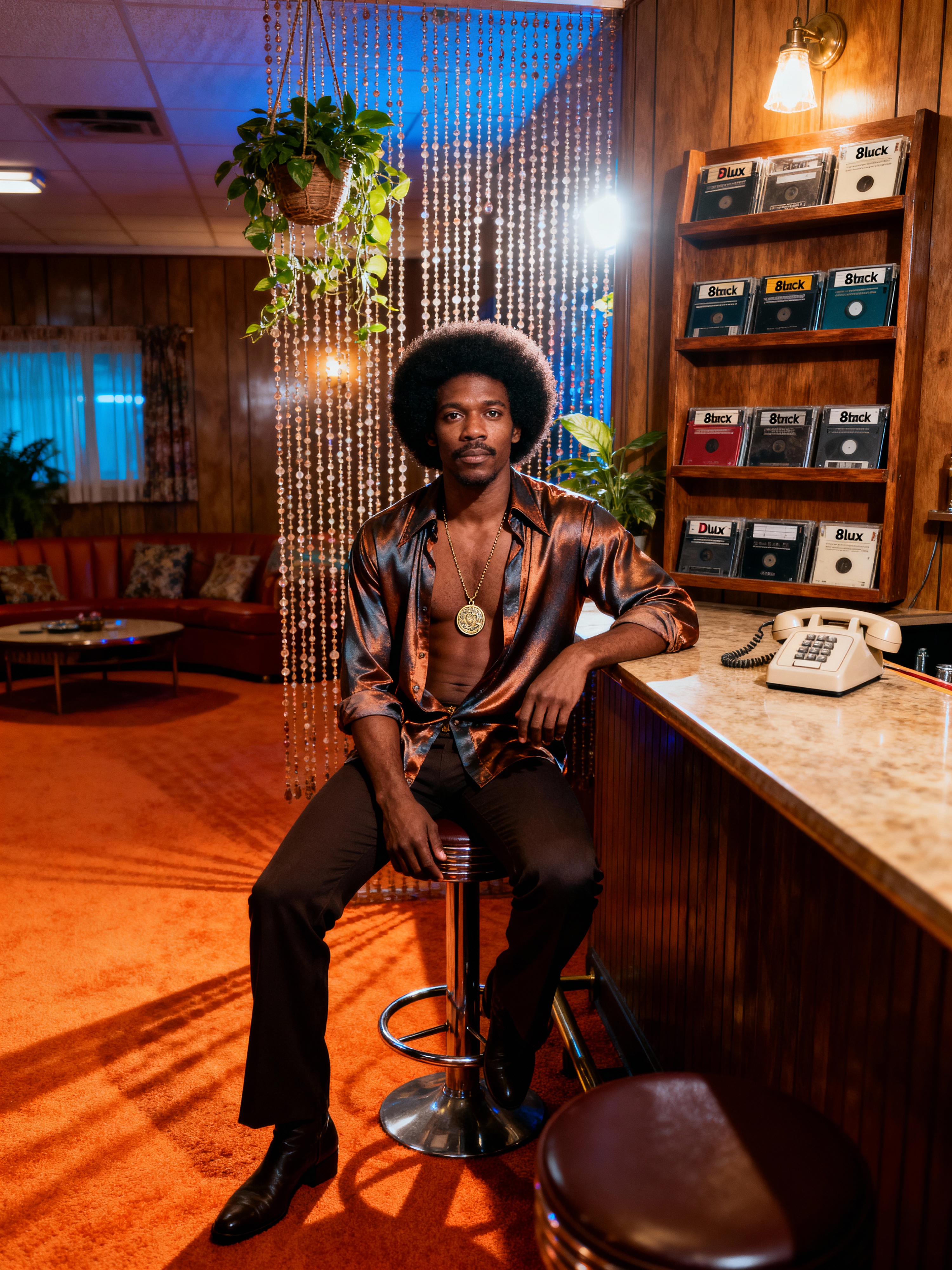model in a 70s rec room with wood paneling and orange carpet, wearing polyester shirt unbuttoned with medallion necklace, sitting at a bar area with a collection of 8-track tapes in a wooden rack, rotary phone on the counter, beaded curtains and hanging plants decorating the space