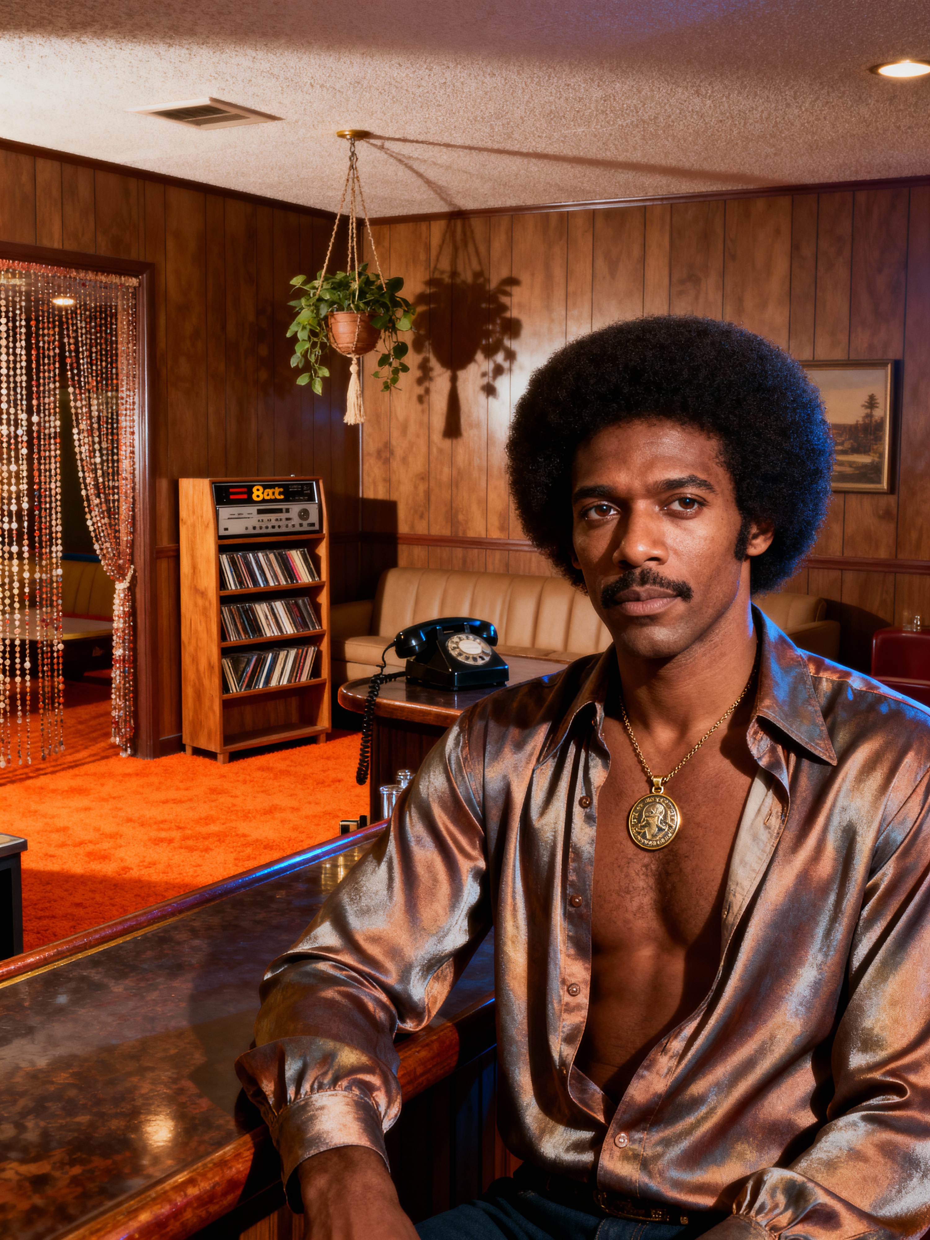 model in a 70s rec room with wood paneling and orange carpet, wearing polyester shirt unbuttoned with medallion necklace, sitting at a bar area with a collection of 8-track tapes in a wooden rack, rotary phone on the counter, beaded curtains and hanging plants decorating the space