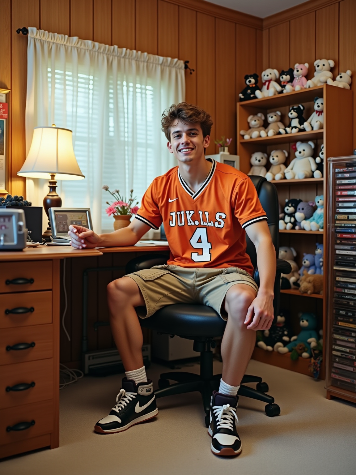 model in a 90s bedroom with wood paneling, wearing high-top sneakers, a jersey, and cargo shorts, sitting at a desk with a clear plastic phone and answering machine, cassette storage tower filled with tapes, beanie babies on shelves