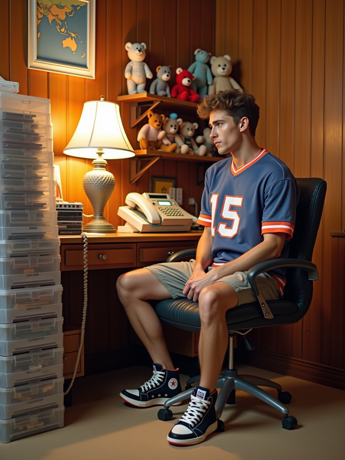 model in a 90s bedroom with wood paneling, wearing high-top sneakers, a jersey, and cargo shorts, sitting at a desk with a clear plastic phone and answering machine, cassette storage tower filled with tapes, beanie babies on shelves