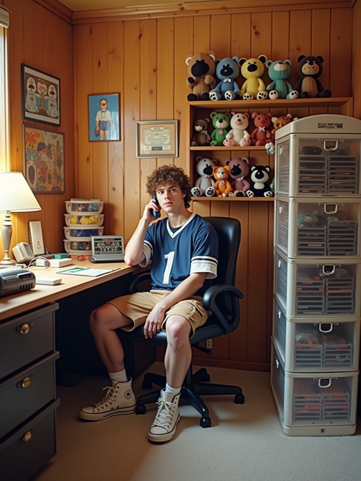 model in a 90s bedroom with wood paneling, wearing high-top sneakers, a jersey, and cargo shorts, sitting at a desk with a clear plastic phone and answering machine, cassette storage tower filled with tapes, beanie babies on shelves