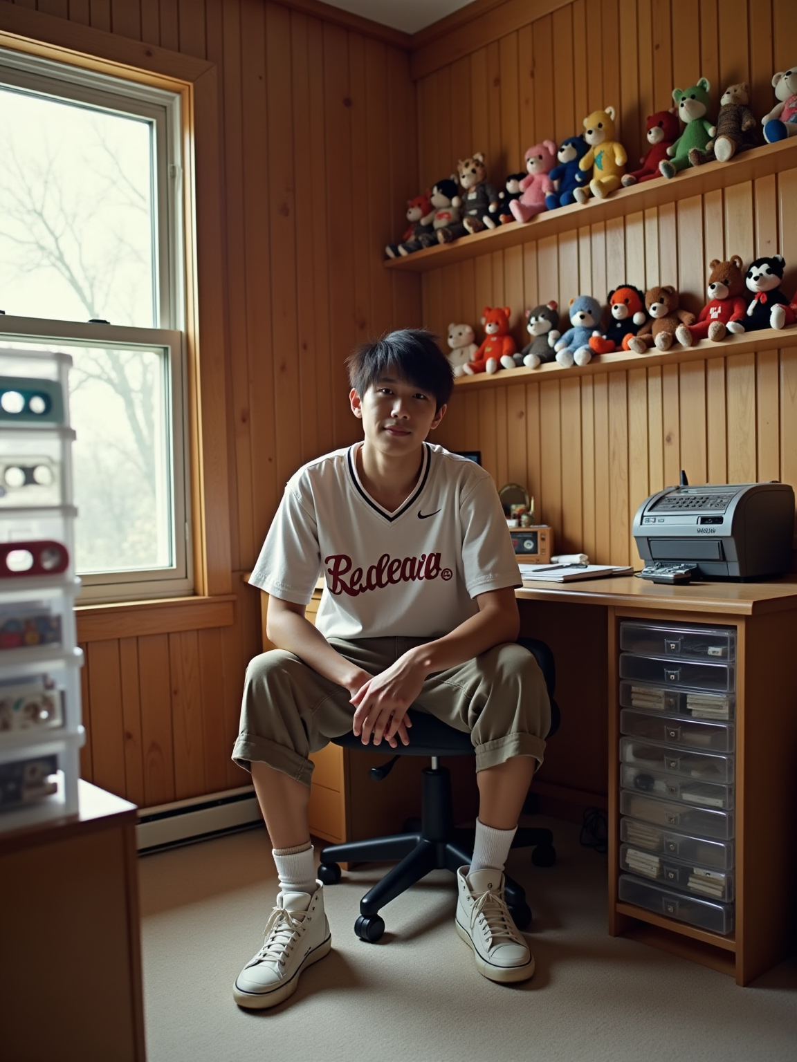 model in a 90s bedroom with wood paneling, wearing high-top sneakers, a jersey, and cargo shorts, sitting at a desk with a clear plastic phone and answering machine, cassette storage tower filled with tapes, beanie babies on shelves