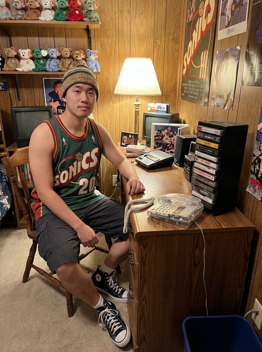 model in a 90s bedroom with wood paneling, wearing high-top sneakers, a jersey, and cargo shorts, sitting at a desk with a clear plastic phone and answering machine, cassette storage tower filled with tapes, beanie babies on shelves