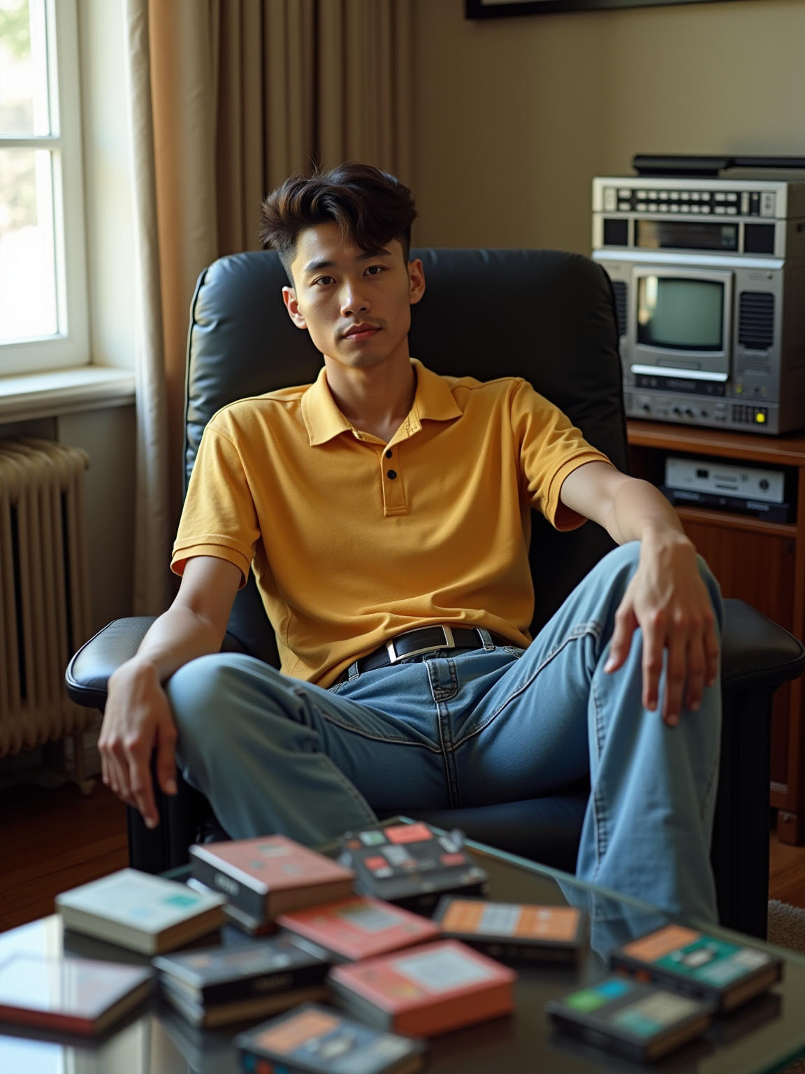 model in a 90s living room, wearing wide-leg jeans and a polo shirt, sitting next to a boombox with dual cassette decks, collection of mixtapes spread on a glass coffee table, VHS tapes stacked by a tube TV