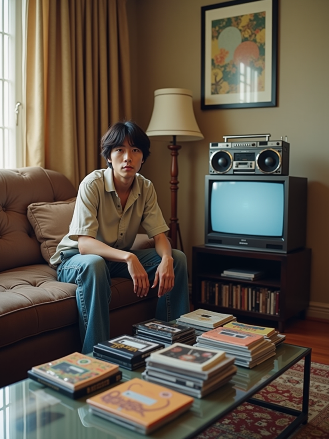 model in a 90s living room, wearing wide-leg jeans and a polo shirt, sitting next to a boombox with dual cassette decks, collection of mixtapes spread on a glass coffee table, VHS tapes stacked by a tube TV